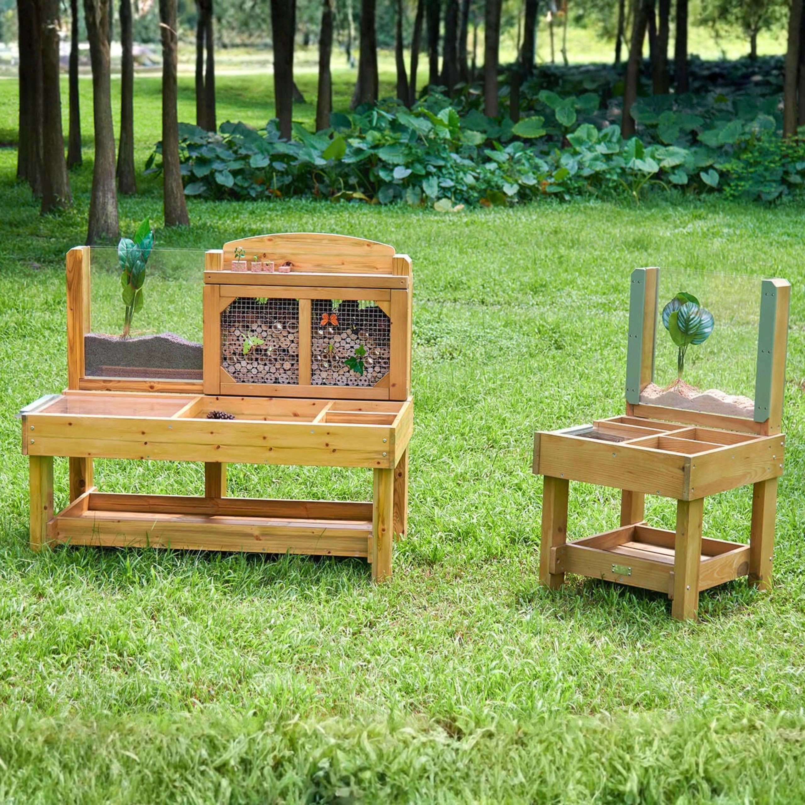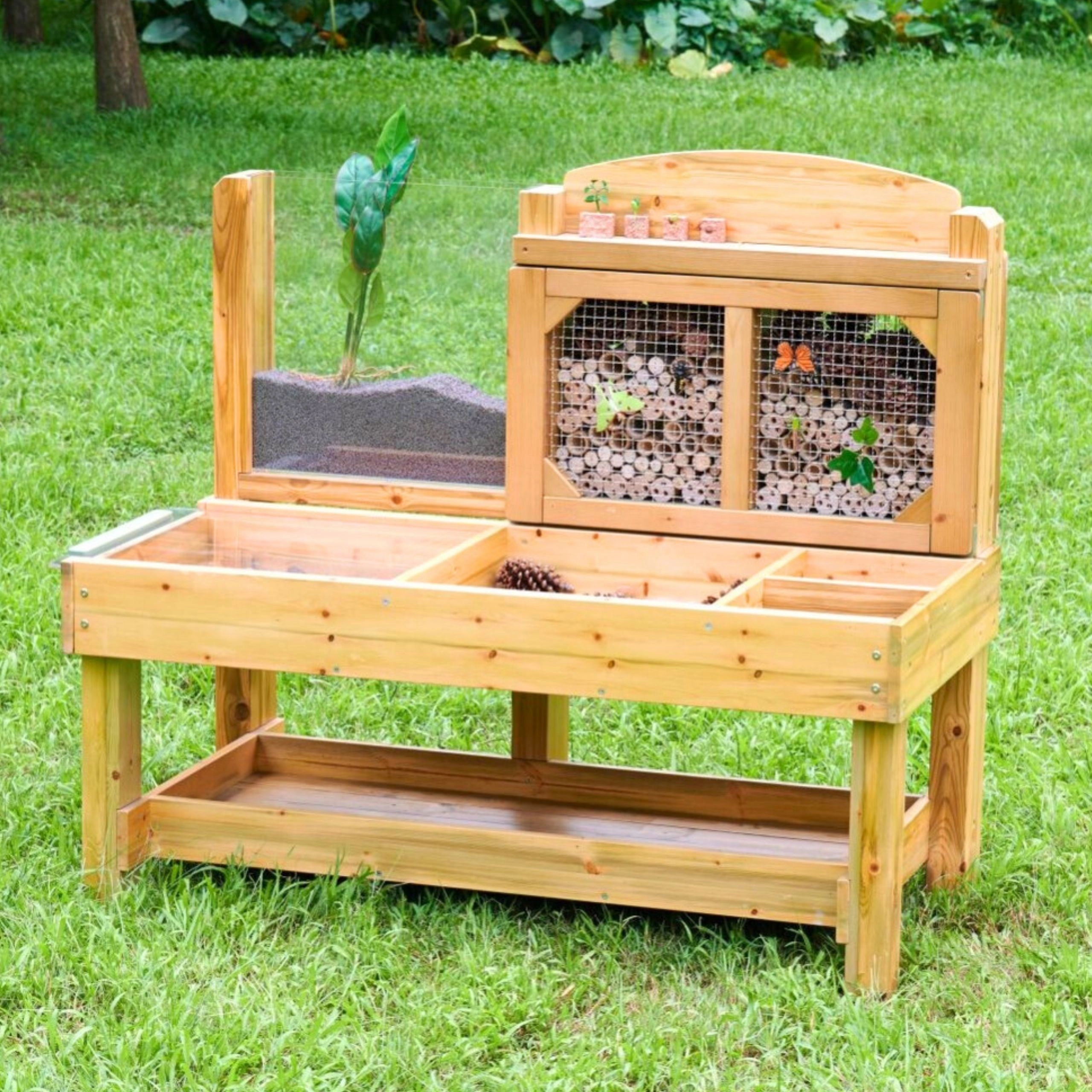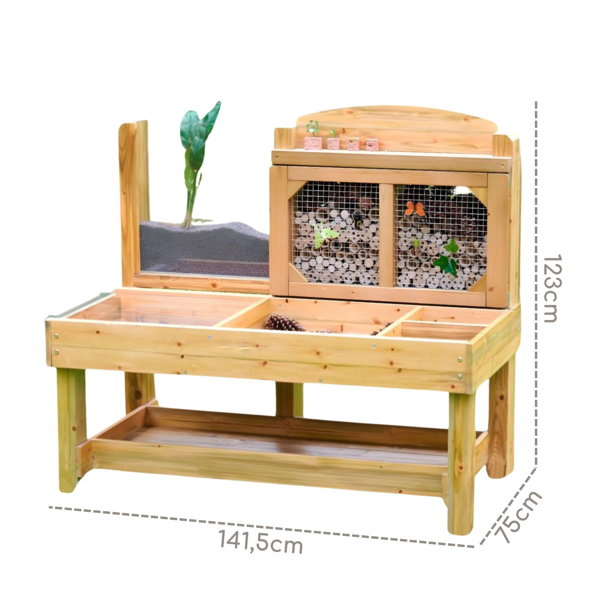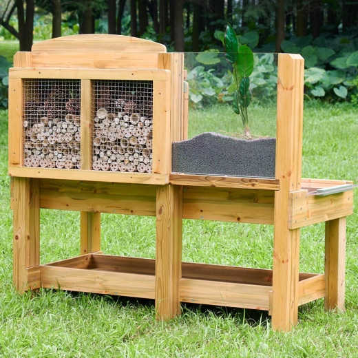 Der medfølger en bagplade med bambusrør bag et metalgitter, som fungerer som et naturligt insekthotel, samt et akryl rodpanel til at følge planters vækst og jordbundsdyrenes bevægelser. Konstruktionen af imprægneret træ er modstandsdygtig over for fugt, skimmel og UV, hvilket gør den ideel til årlig udendørs udforskning.