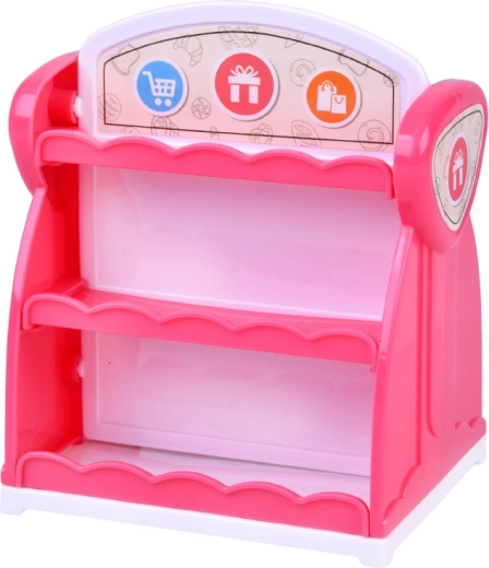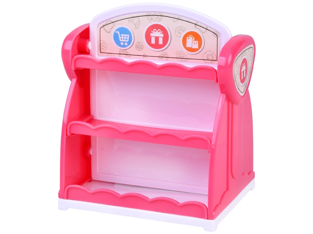 Den lyserøde, lette og nemt aftørrelige reol med to sider og flere hylder forvandler værelset til en lille butik med modellerede kreationer.