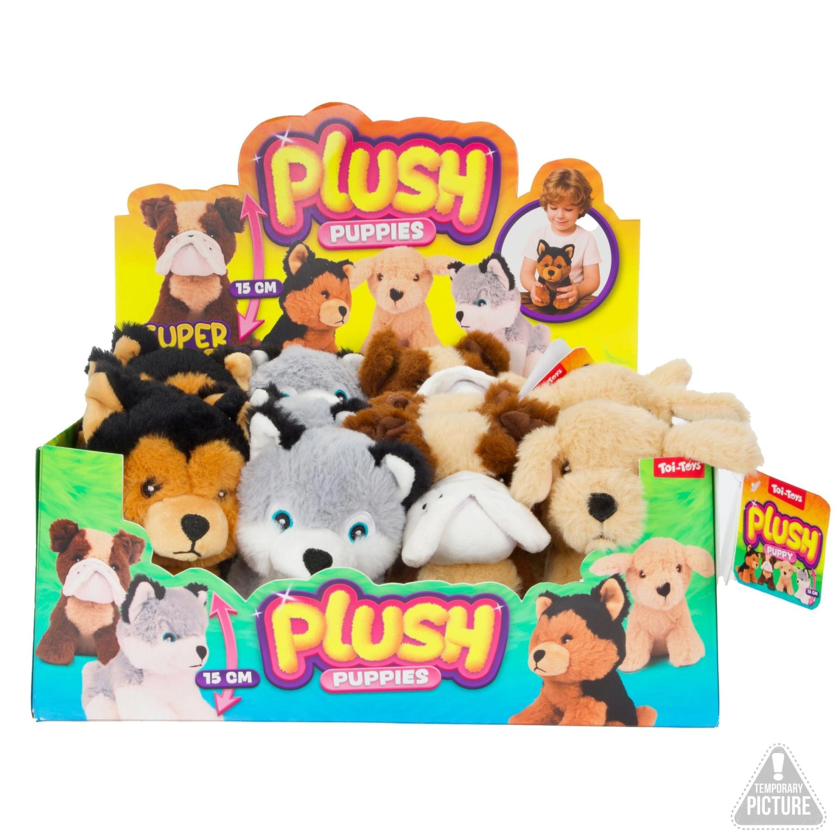 Den søde plyshund på 15 cm vil glæde ethvert barn. Den er lavet af blødt og behageligt materiale, ideelt til kram og leg. Hver hund har et unikt udtryk og look, så børnene nemt kan finde deres favorit eller samle hele flokken.