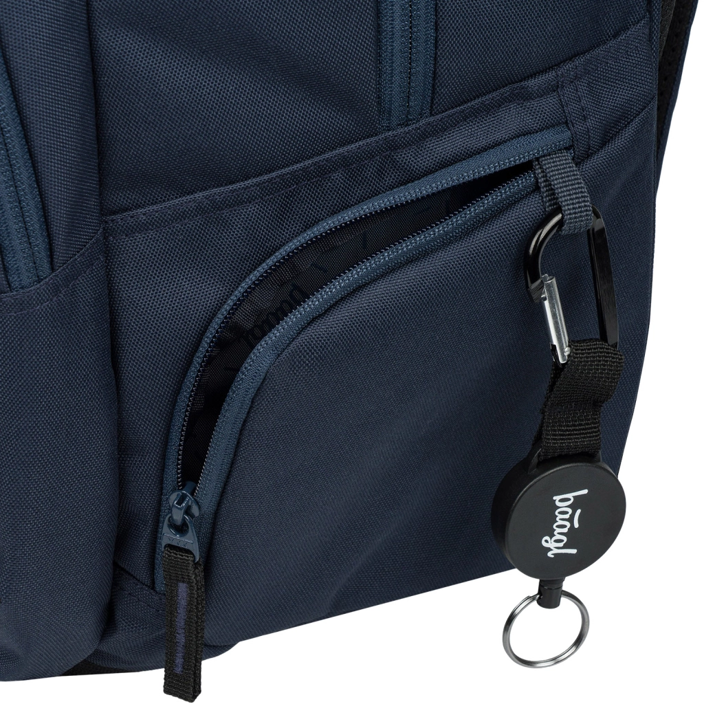 Tre rum, lomme til 17" bærbar, integreret organizer og selvoptrækkende holder til nøgler/chip for overblik og sikkerhed for dine ting.