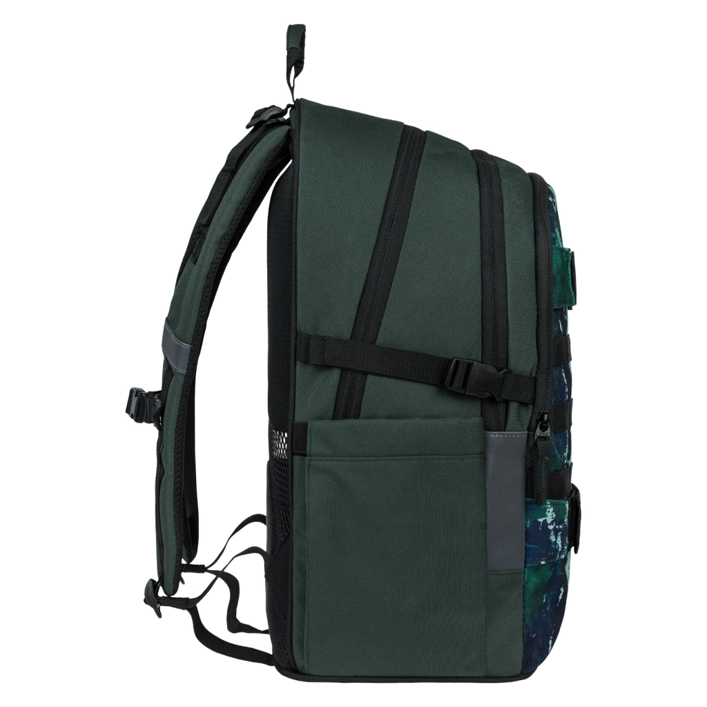 Komplet skoleudstyr i det ensartede Forest-design til ældre elever og studerende. Sættet indeholder en robust skoletaske med skateboard-fastgørelse, et rumligt penalhus, en sammenfoldelig sportstaske, en praktisk bæltetaske og et beskyttende cover til laptop. Materialer med GRS-certificering, vandafvisende overflade, sikre reflekterende elementer og pålidelige YKK-lynlåse sikrer komfort, orden og lang levetid.