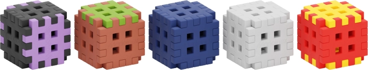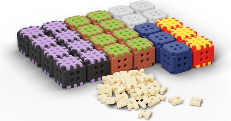 Waffle-designet med net af åbninger muliggør faste, flersidede forbindelser og stabile 3D-konstruktioner, som kan ombygges frit.