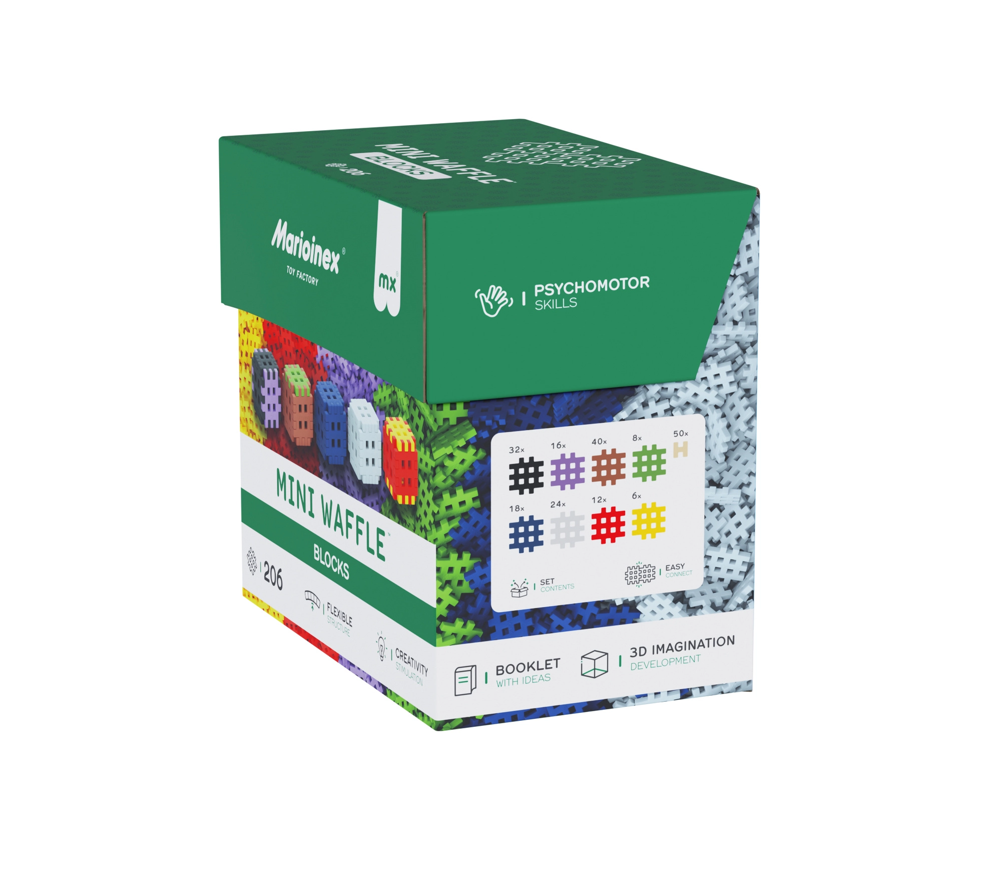 Det unikke waffle-design muliggør faste og gentagne samlinger, så børn kan ombygge deres skabelser når som helst. Byggesættet udvikler kreativitet, øje–hånd-koordination og tålmodighed og passer til både piger og drenge fra 3 år.