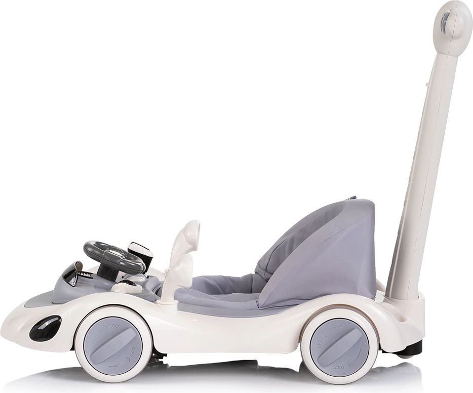 Takket være den justerbare højde vokser gåstativet med barnet, forældregrebet hjælper med sikker styring, og solskærmen beskytter mod solen. Maksimal sikkerhed sikres af skridsikre puder, bremser, hjullås og hastighedsregulering via justering ved hjulene. Til panelet og forlygterne bruges almindeligt tilgængelige AA-batterier.