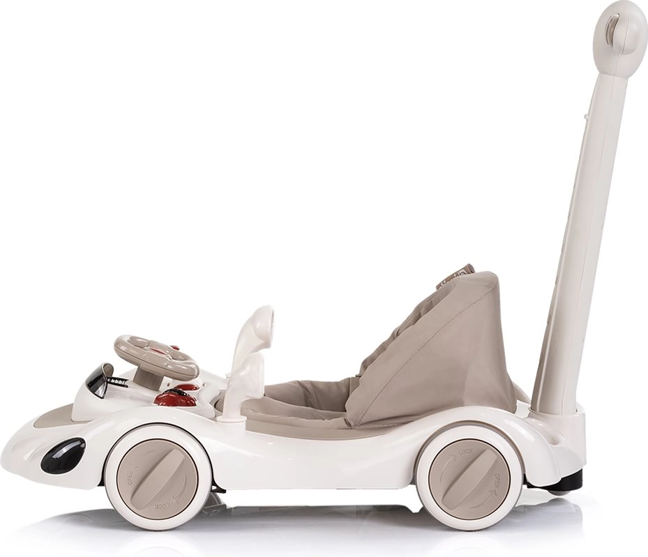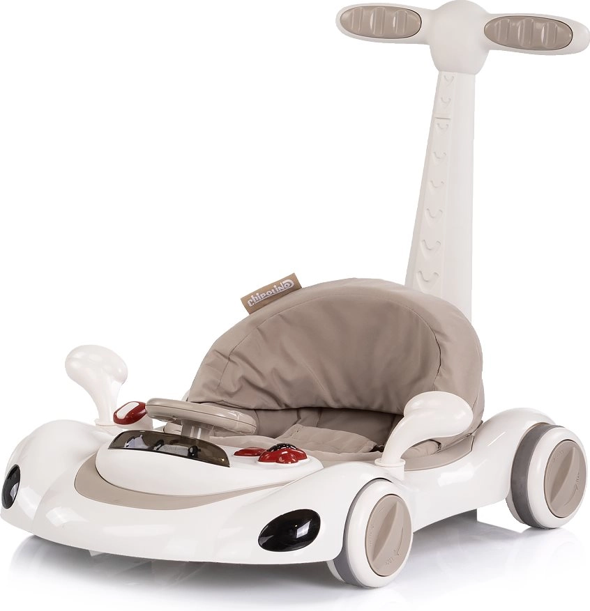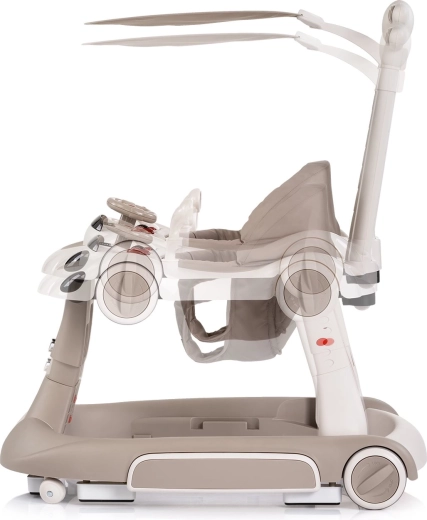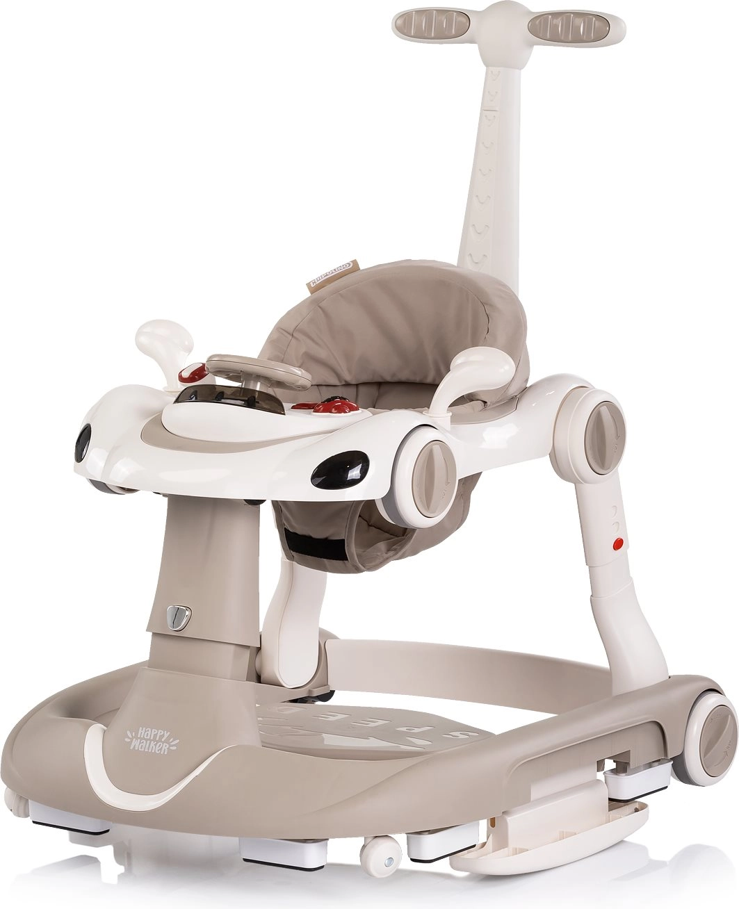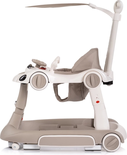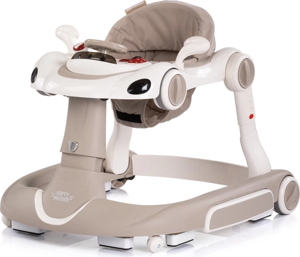 Det interaktive 5-i-1 Happy Walker gåstativ i elegant beige er designet til komfortabel og sikker gangtræning. Den brede og stabile base, kvalitets hjul med mulighed for hjullås og hastighedsregulering samt et blødt, polstret sæde giver tryghed og komfort. Med det forældrehåndtag kan du sikkert guide barnet, mens solskærmen beskytter mod solen.