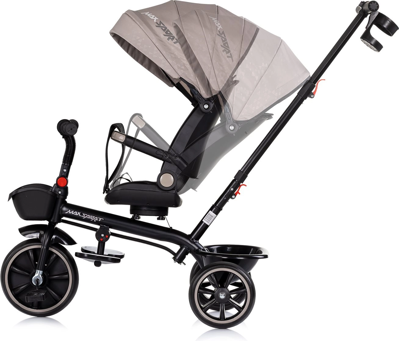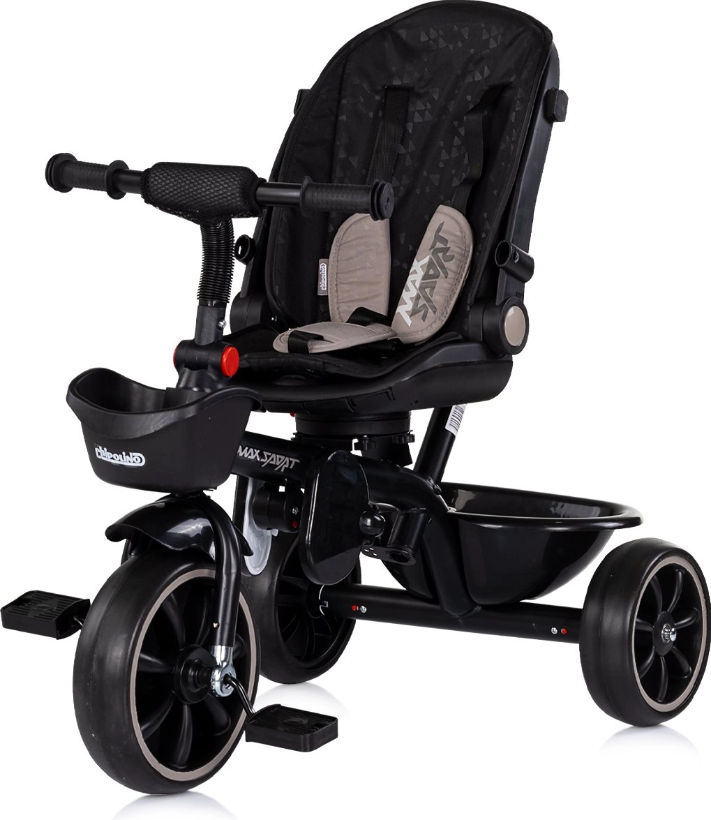 For maksimal komfort er trehjulecyklen udstyret med blød tekstilpolstring, sikkerhedssele, foldbare fodstøtter og rumlige kurve for og bag. Det justerbare forældrehåndtag i to højder giver sikker styring og kontrol over retningen. Den sammenklappelige kaleche med solskærm beskytter mod solen, og kopholderen kan monteres i to positioner.