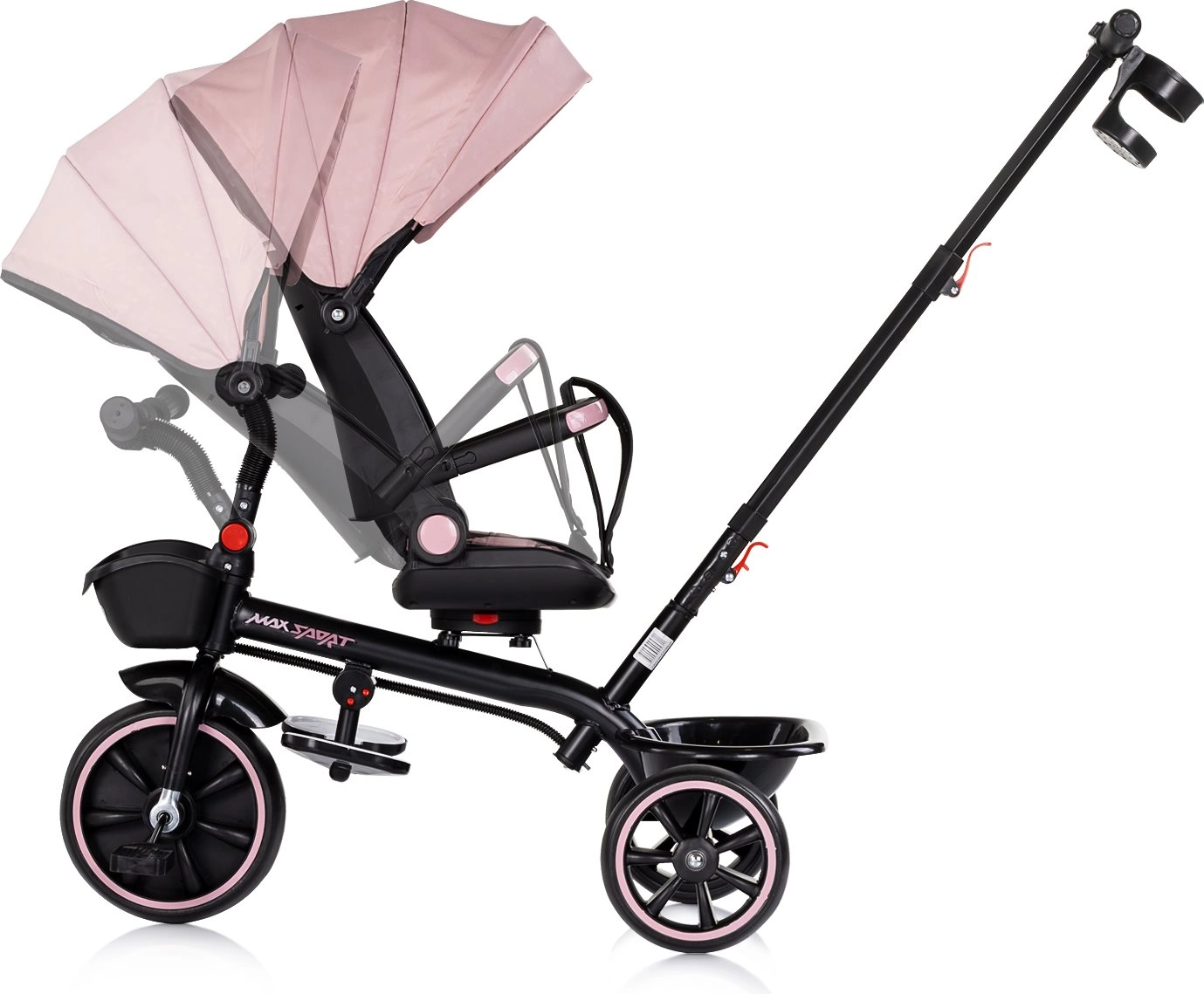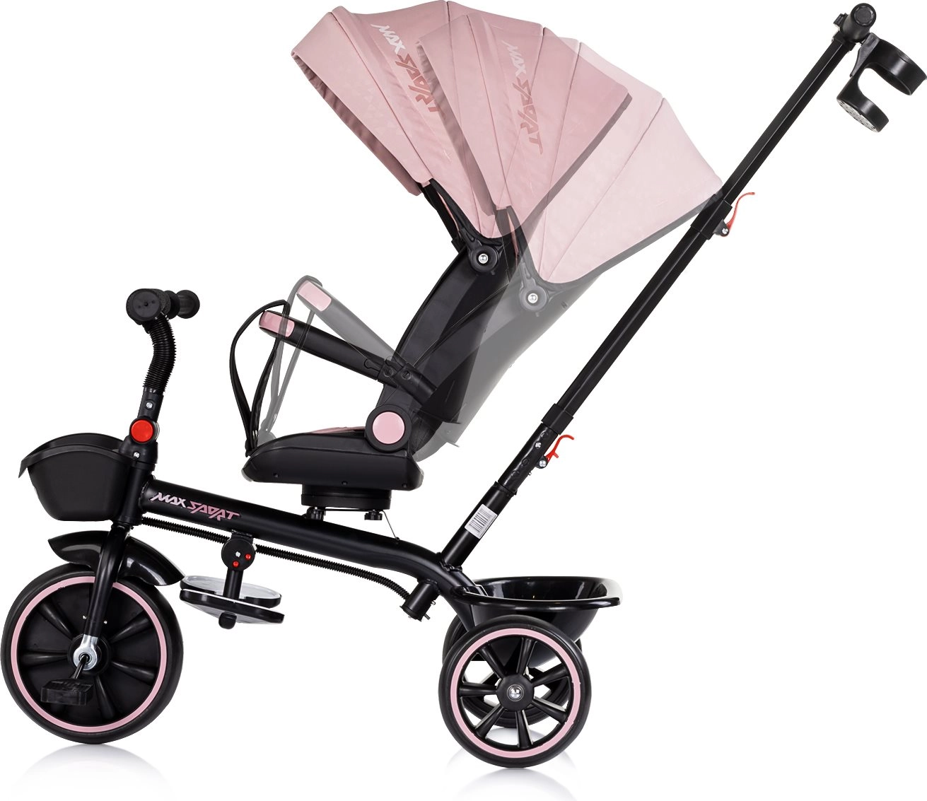 Oplev en komfortabel og sikker kørsel med trehjulet cykel CHIPOLINO Max Sport 2-i-1 i farven Powder Pink. Denne model vokser med barnet og tilbyder to brugstilstande – forældrestyring med styrestang og barnets egen pedalkørsel. Takket være 360° drejbart sæde, blød polstring, sikkerhedssele og sammenklappelig kaleche med solskærm er turen altid komfortabel og beskyttet. Der er også for- og bagkurv, klapbar fodstøtte og justerbart forældrehåndtag for maksimal bekvemmelighed.