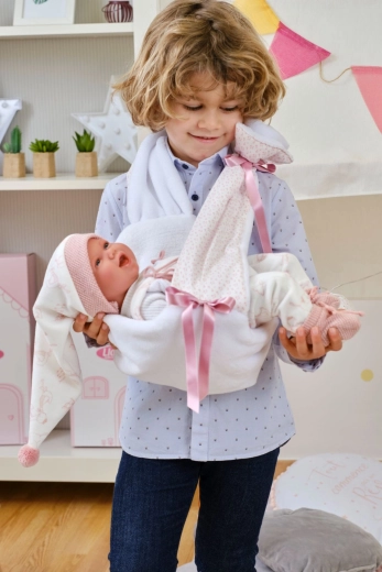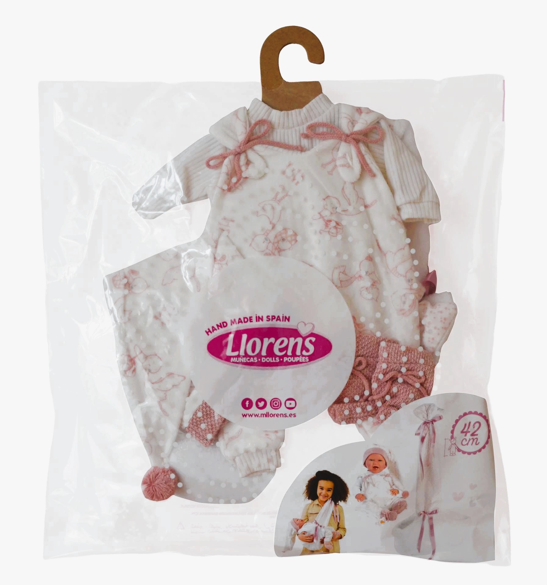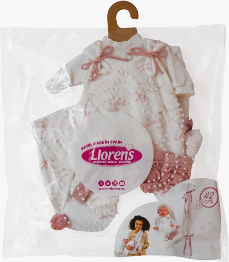Sættet er håndlavet i Spanien og designet til Llorens NEW BORN-dukker på 40–42 cm. Takket være kvalitets-syning og detaljer – såsom sløjfer, ribkanter og strikkede futter – fremstår tøjet realistisk og elegant. Fantastisk til at udvikle finmotorik, empati og fantasi hos børn.