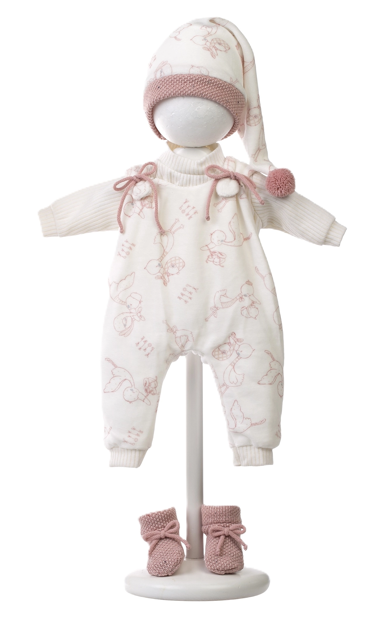 Sættet indeholder body/heldragt med sødt mønster, lang hue og strikkede futter i sarte farver – alt i behagelige tekstiler for nem påklædning og dukke-komfort.