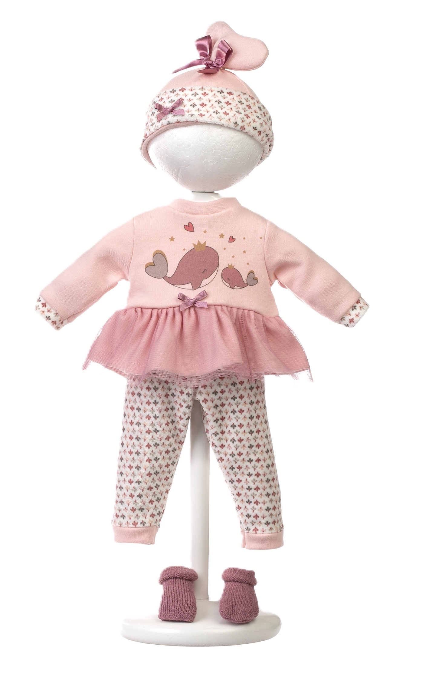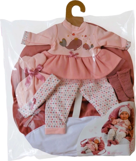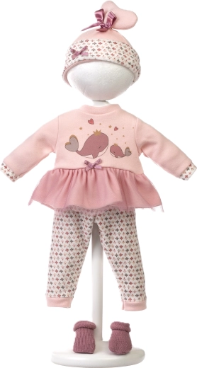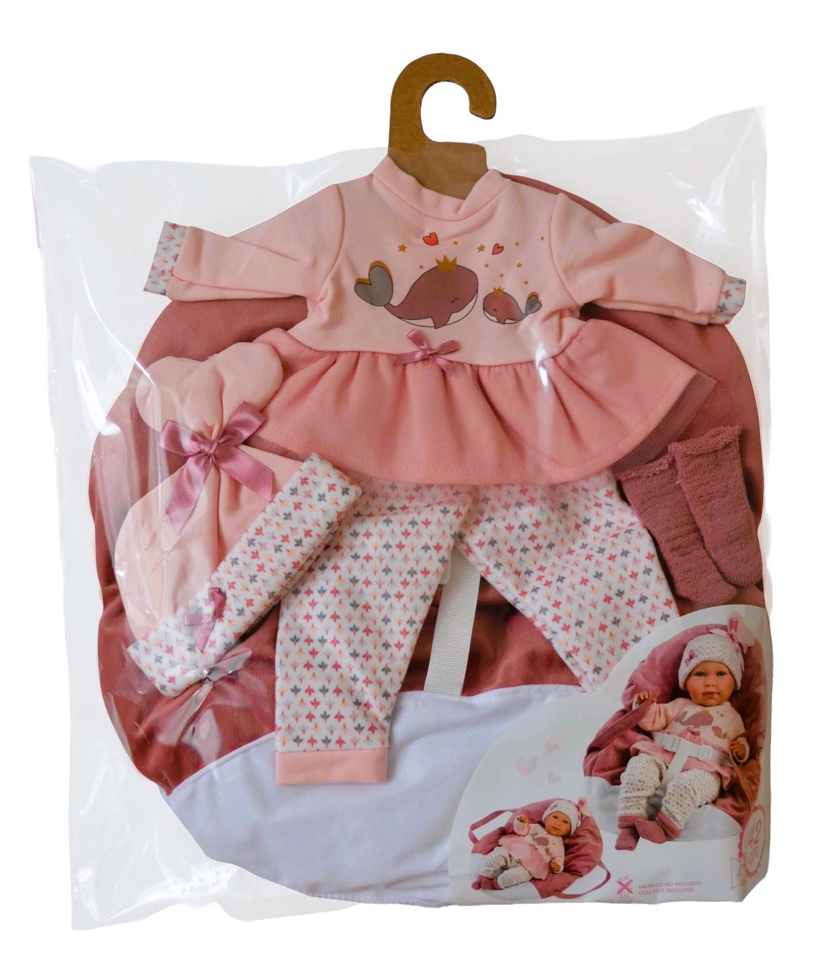 Gør dukken fin fra top til tå – rosa top/kjole med hvalmotiv, leggings, hue og sko suppleres af en blød håndbæresele.