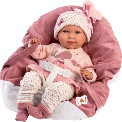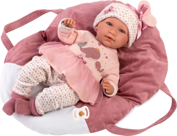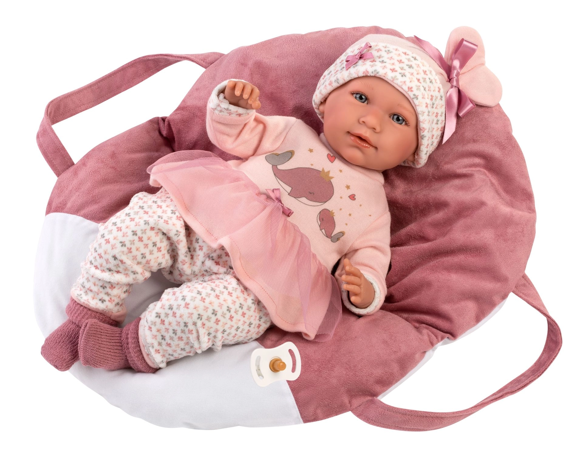 Giv din dukke komfort og stil. Dette 5-delte sæt til NEW BORN Llorens-dukker (40–42 cm) indeholder matchende tøj i blide rosatoner med et legende hvalmotiv samt en blød bæresele/pude med tredelt sele. Takket være håndværket i Spanien kan du regne med omhyggelig udførelse og behagelige materialer velegnet til børnehænder.