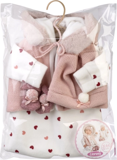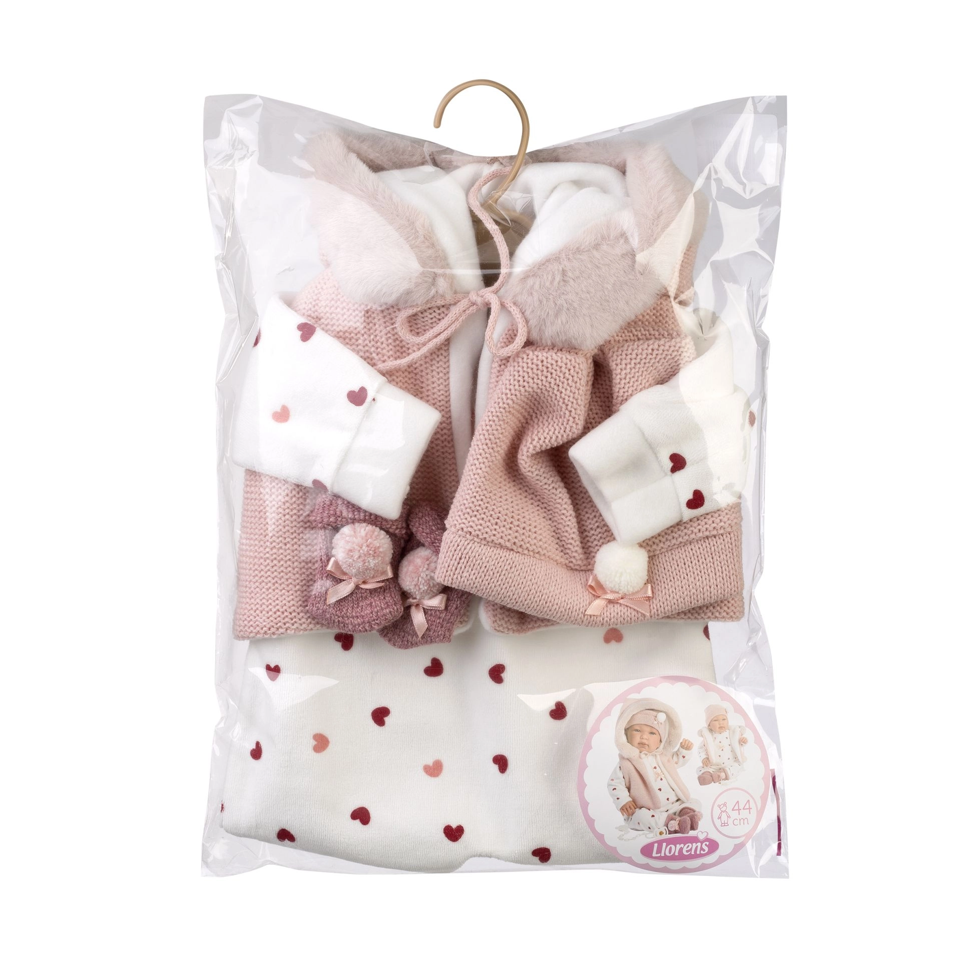 Sættet er designet til dukker i størrelsen 43–45 cm og passer perfekt til populære Llorens-modeller. Takket være den praktiske emballage med bøjle er opbevaring og organisering af garderoben let og overskuelig.