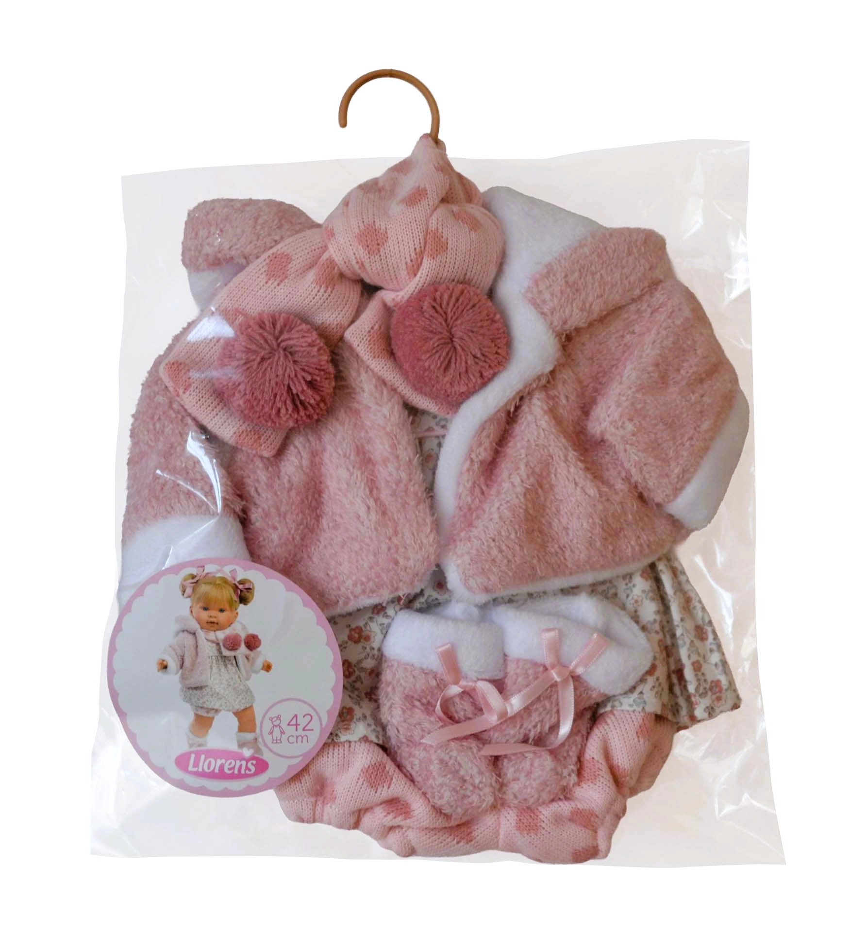 Et stilfuldt sæt til LLORENS-dukker i størrelsen 42 cm, som vil glæde enhver lille modeentusiast. Indeholder 5 omhyggeligt matchende dele i bløde tekstiler – en lyserød, vamset jakke med hvid kant, hue/halstørklæde med pomponer, vanter og blomstrede kjole med trusser. Tøjet er håndlavet i Spanien og leveres i en praktisk emballage med bøjle. Ideelt til rolleleg og udvikling af finmotorik. Velegnet fra 3 år.