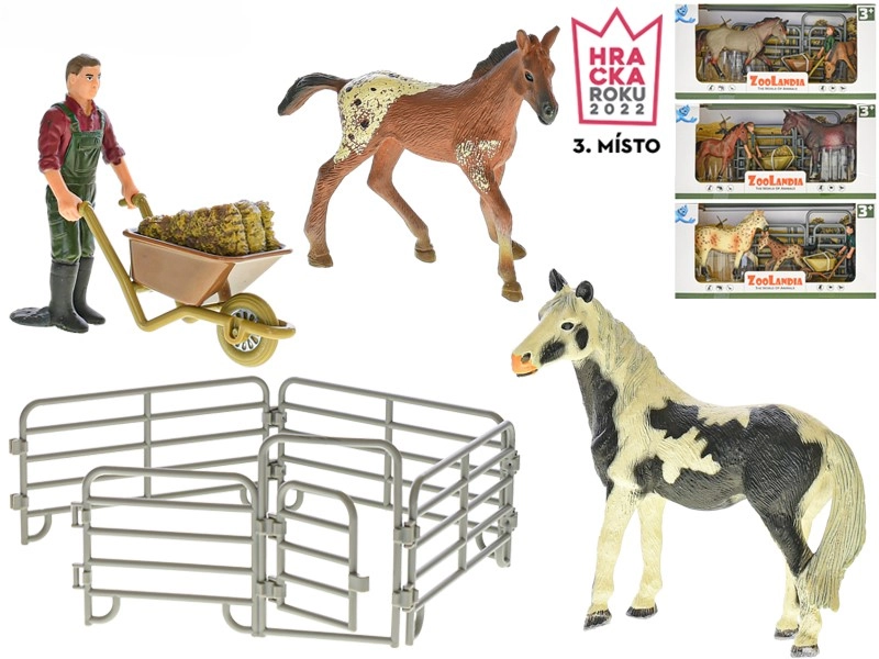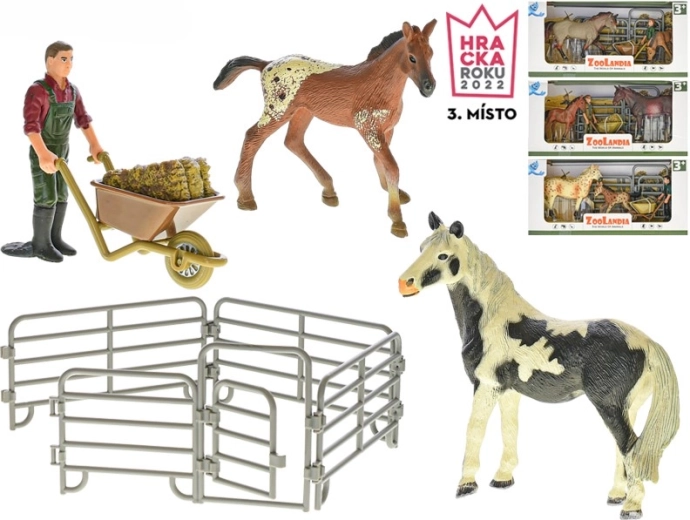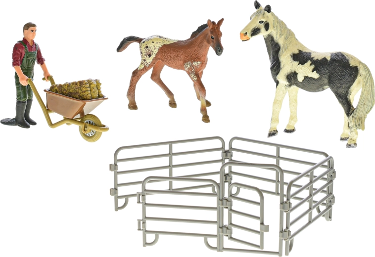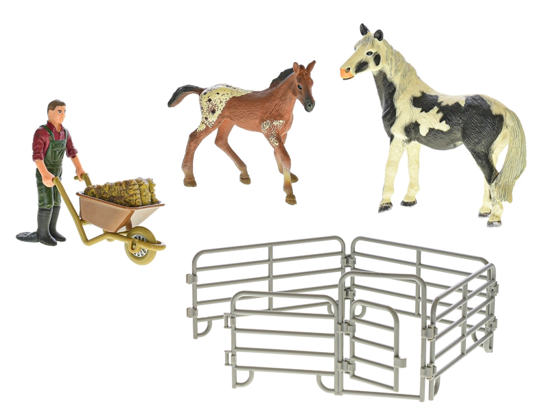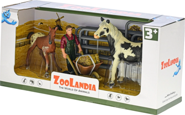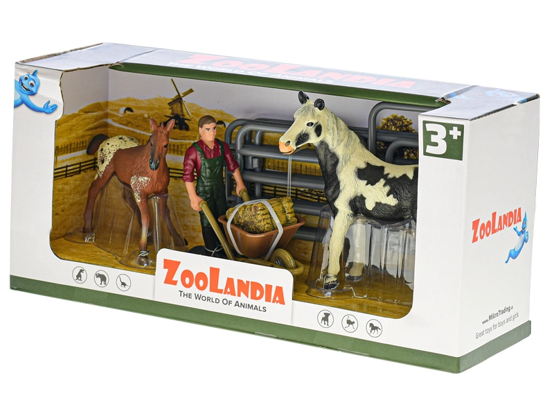 Væk børnenes fantasi med ZOOLANDIA gårdsættet. Realistisk formede figurer af hest og føl, fritstående landmand og modulær indhegning med åbningsbar låge skaber den perfekte base for gårdhistorier. Børn kan fodre, køre hø og sikkert lukke dyrene inde i folden.