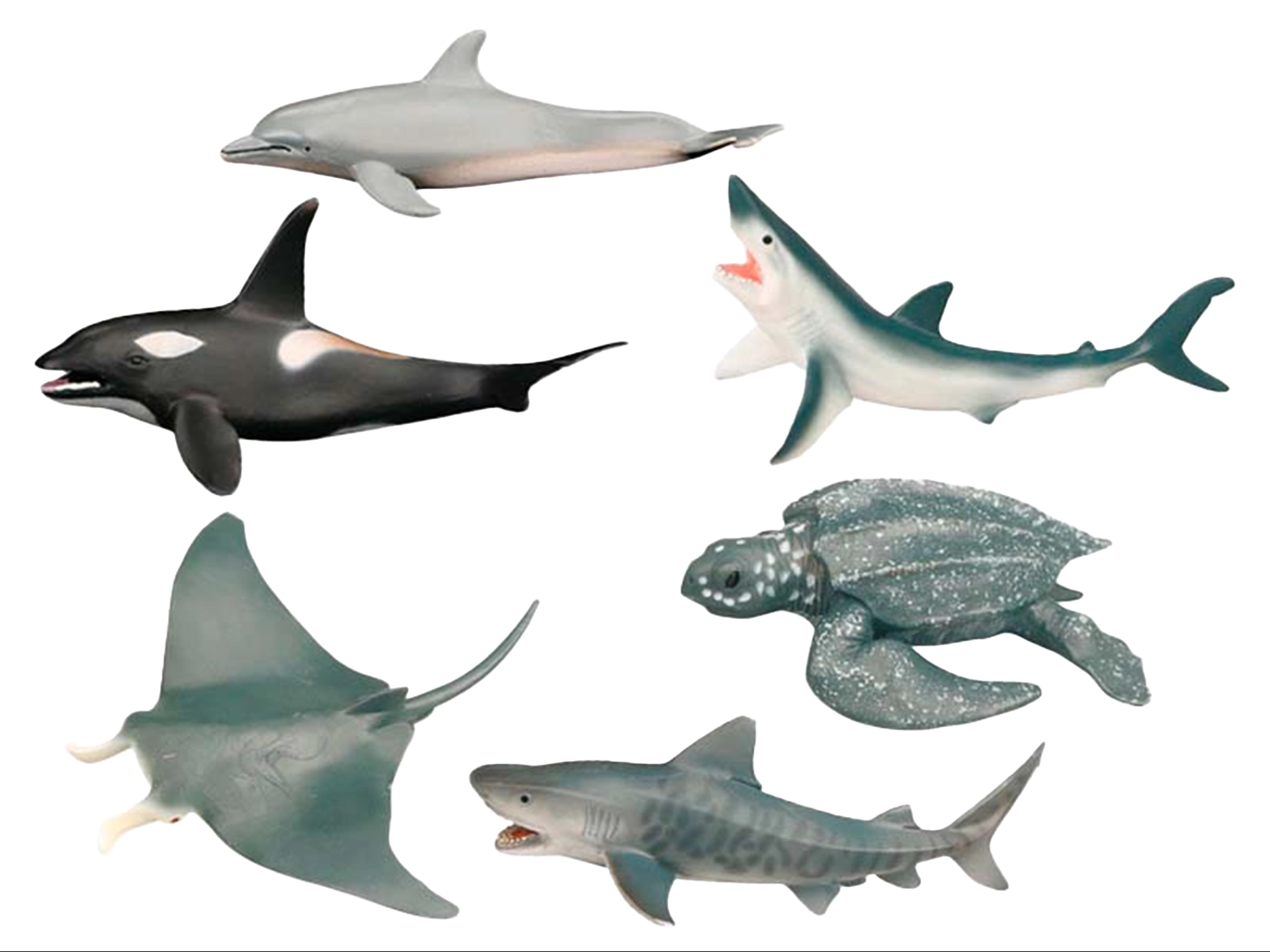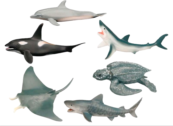 • 6 realistiske arter – spækhugger, haj, delfin, tigerhaj, djævlerokke og søløve.
