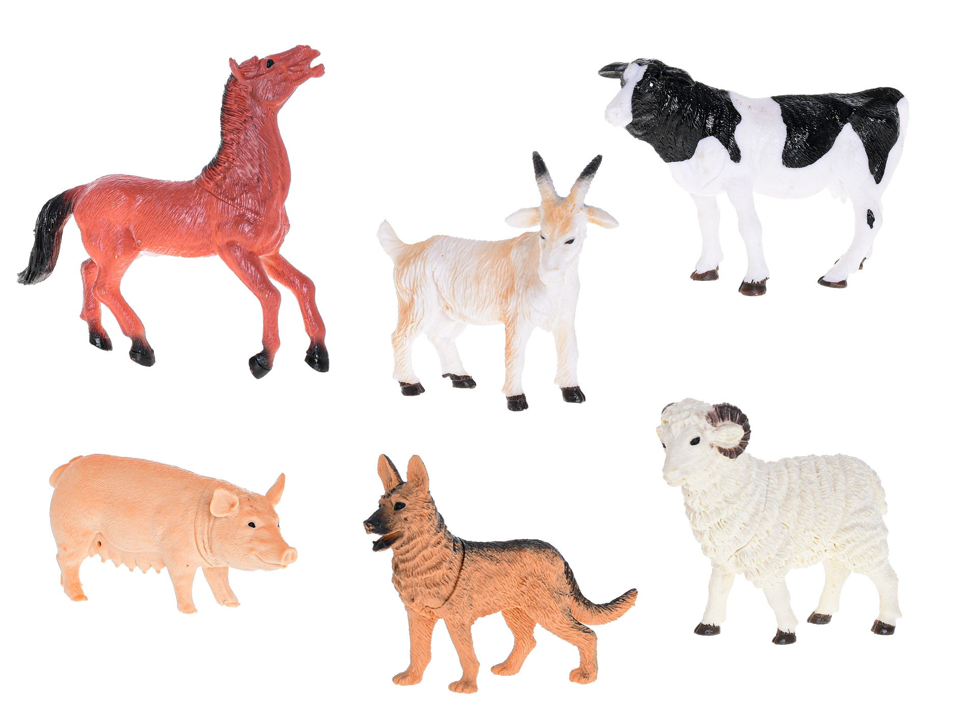 Udforsk livet på landet med dette sæt plastfigurer af bondegårdsdyr. Indeholder 6 detaljerede figurer – en gris, en ged, en vædder, en hest, en hund og en ko. Figurerne måler 10–14 cm og er fremstillet af kvalitets- og holdbar plast, ideelle til børn fra 3 år. De understøtter fantasi, realistisk leg og udvikling af finmotorik.