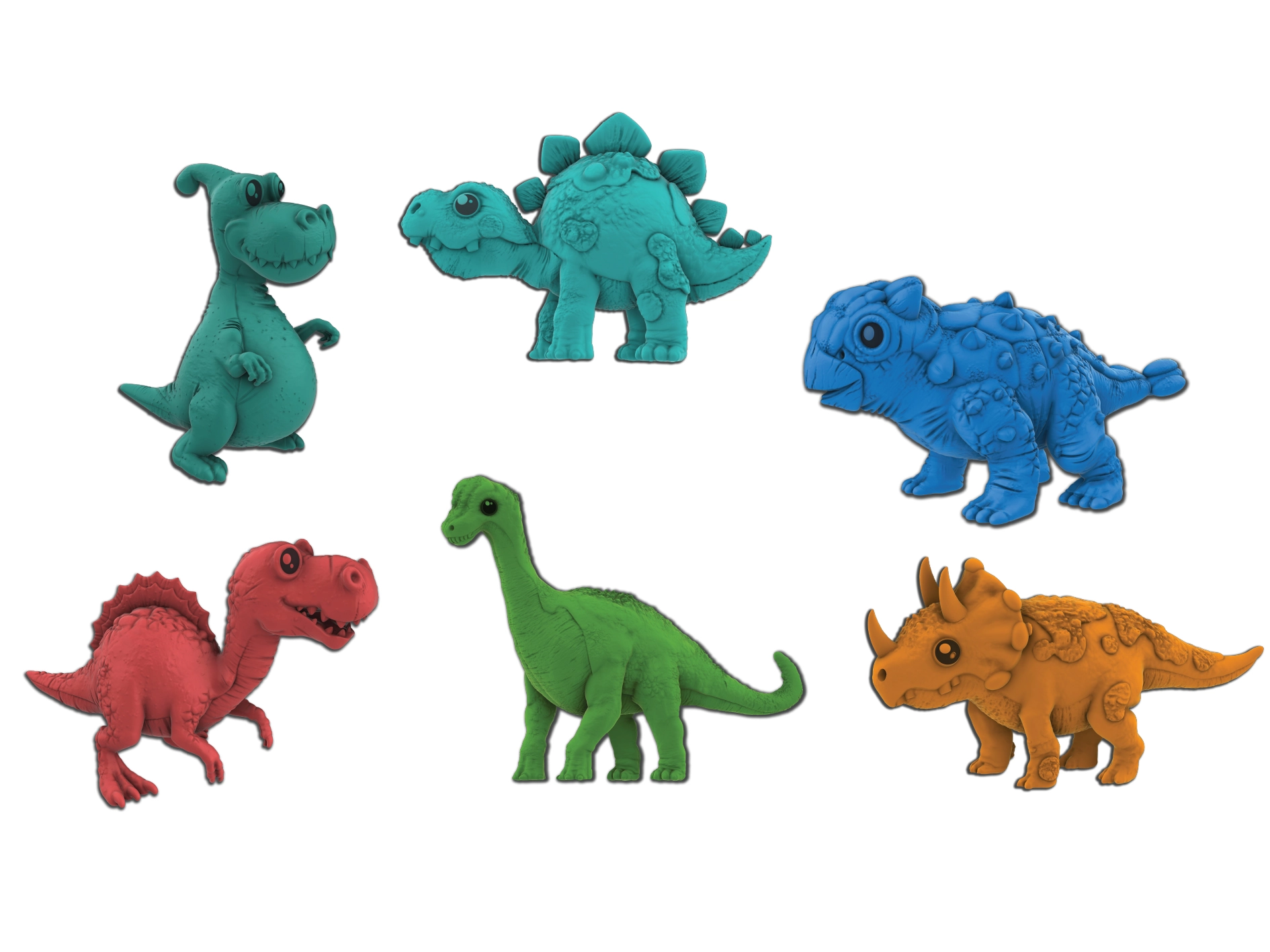 T‑Rex, Brontosaurus, Stegosaurus, Triceratops, Parasaurolophus, Ankylosaurus, Spinosaurus, Plesiosaurus