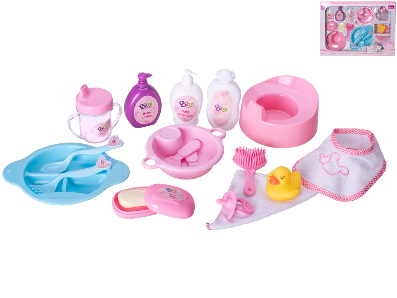 Komplet sæt med babytilbehør indeholder 18 stk. tilbehør til realistisk pleje af dukker. Ideelt til at udvikle sociale færdigheder og empati hos børn. Fremstillet af kvalitetsplast i en attraktiv lyserød–blå–hvid kombination, pakket i en praktisk æske for nem transport og opbevaring.