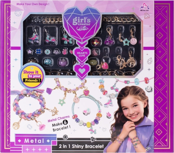 Lav dine egne unikke smykker med dette armbåndssæt, som indeholder materiale til 6 armbånd og stilfulde metalvedhæng med smileyer, hjerter, rulleskøjter, scooter og flere motiver. Skaberi styrker finmotorik, tålmodighed og kreativitet. Alt er opbevaret i en praktisk gaveæske, ideel som gave til små pyntedukker og kreative børn fra 5 år.