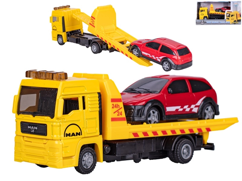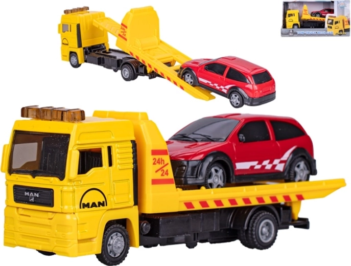 Sættet indeholder et robust MAN-bugseringskøretøj på 19 cm og en personbil på 10,5 cm. Begge modeller er fremstillet i en kombination af metal og kvalitetsplast, hvilket sikrer modstandsdygtighed ved daglig leg. Realistiske detaljer og frihjul vil glæde små bilentusiaster og samlere.