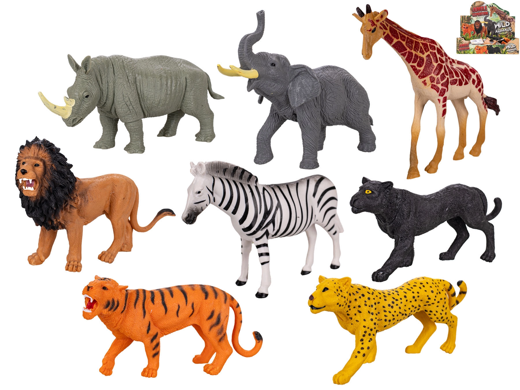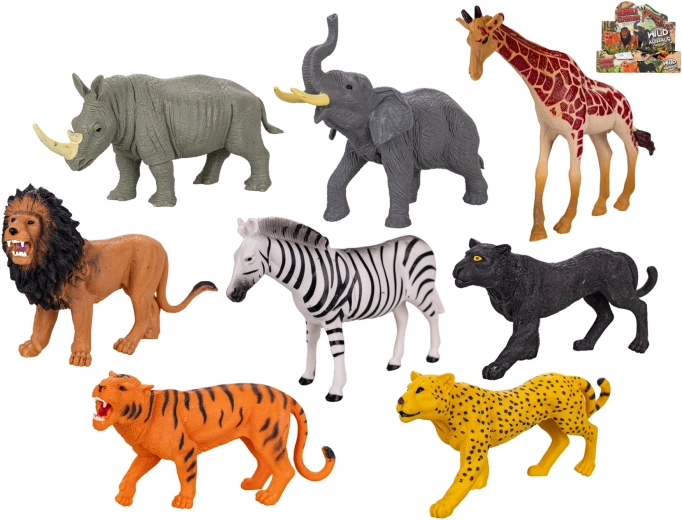 • 8 realistiske figurer: zebra, giraf, tiger, jaguar, leopard, næsehorn, løve og elefant