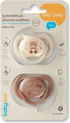 Berolig din baby med et blidt strejf af komfort – sættet indeholder 2 symmetriske silikonesutter til 0–6 måneder: én til dag og én med selvlysende håndtag til natten. Blød, hypoallergen silikonesut med tynd hals er skånsom mod gummer og tænder, mens formet skjold med ventilationshuller understøtter fri vejrtrækning og beskytter sart hud. BPA-fri, nem at rengøre og sterilisere.