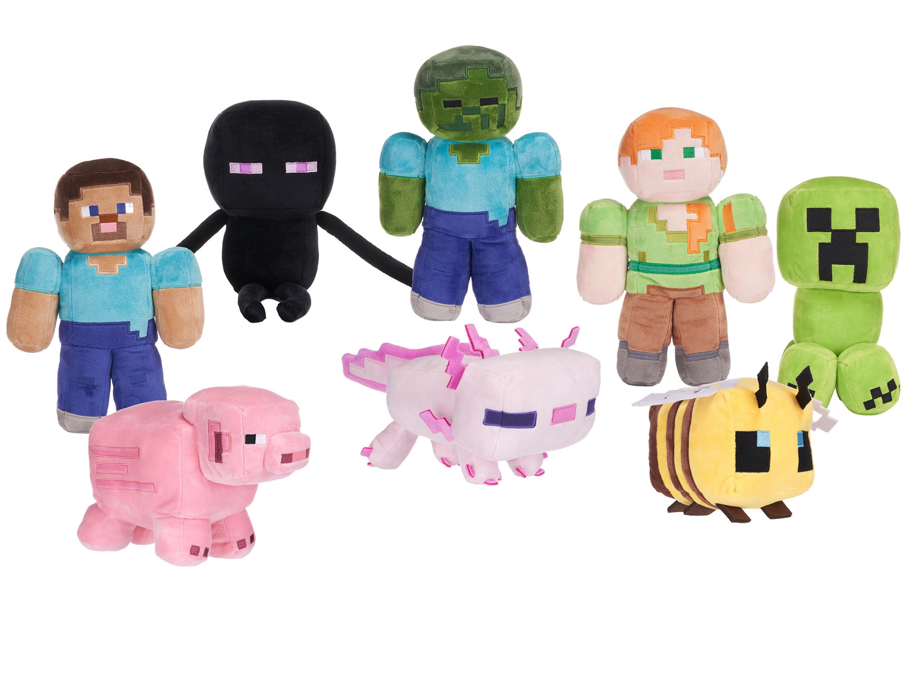 I kollektionen finder du otte ikoniske figurer: Steve, Alex, Enderman, Zombie, Creeper, gris, axolotl og bi. De forskellige størrelser fra 17 til 34,5 cm gør det nemt at vælge den ideelle makker – fra en lommeven til en iøjnefaldende dekoration på hylden eller sengen. Perfekt som gave til børn, men også som samlergenstand for fans af spilverdenen.