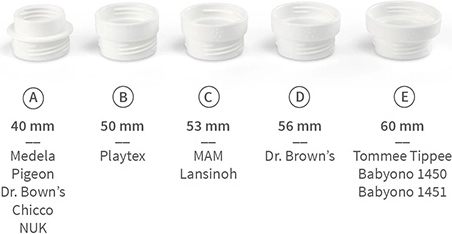 Pakken indeholder fem udskiftelige adaptere (40–60 mm) til mærker som Medela, Chicco, NUK, Dr. Brown’s, Pigeon, Playtex, MAM, Lansinoh, Tommee Tippee m.fl. 43 mm flasker (Avent, BabyOno 402/403) kan bruges uden adapter.