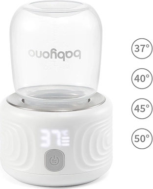 Varmen bringer mælk til 37 °C på cirka 2 minutter og tilbyder fire temperaturvalg: 37, 40, 45 og 50 °C. Når temperaturen er nået, holdes den stabil, og en lydsignal giver besked.