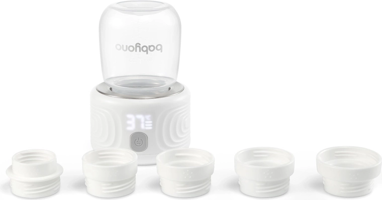 I pakken finder du alt, hvad du behøver: en flaske på 180 ml, fem udskiftelige adaptere til populære fl askemærker og et USB‑C-kabel. Takket være det lette og kompakte design passer varmeren i håndtaske, pusletaske og barnevogn, og den stille drift forstyrrer ikke babyens søvn.