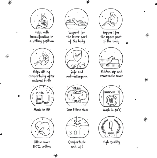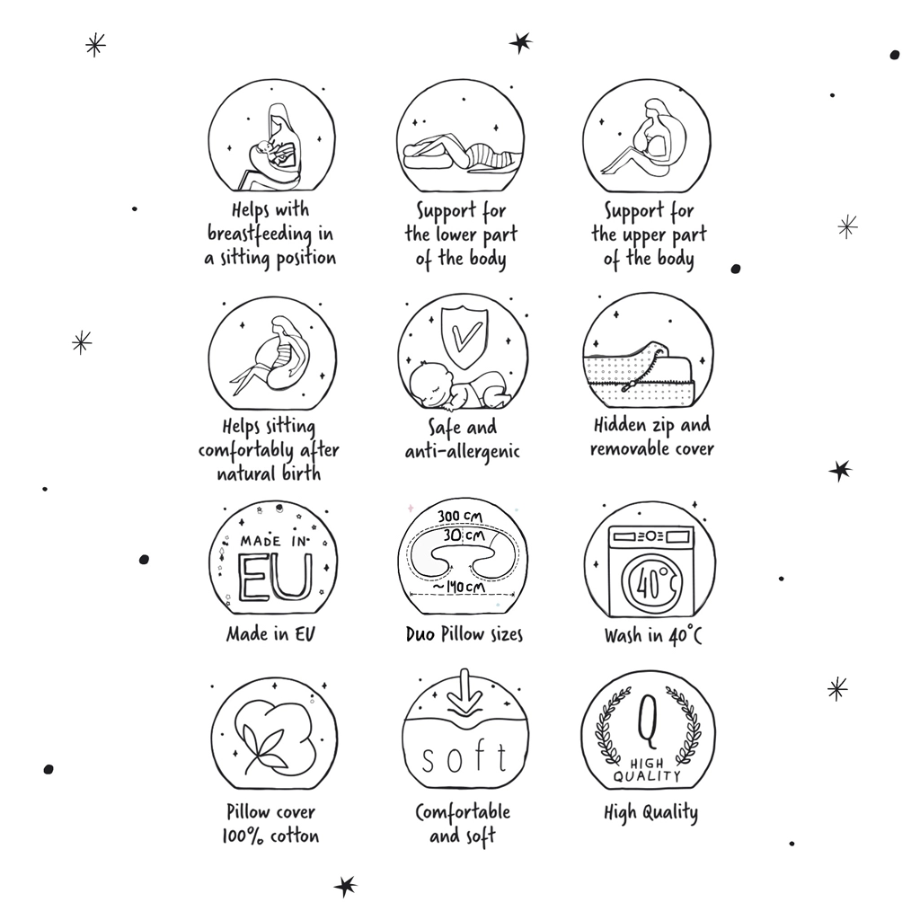 Med en længde på 300 cm skaber puden et behageligt “rede”-miljø, som forbedrer lejring og hjælper kroppen med at slappe af. Formen som et stort “C” gør det lettere at finde den rigtige ammestilling, hjælper med at reducere spændinger i skuldrene og fremmer ergonomisk støtte til barnet.