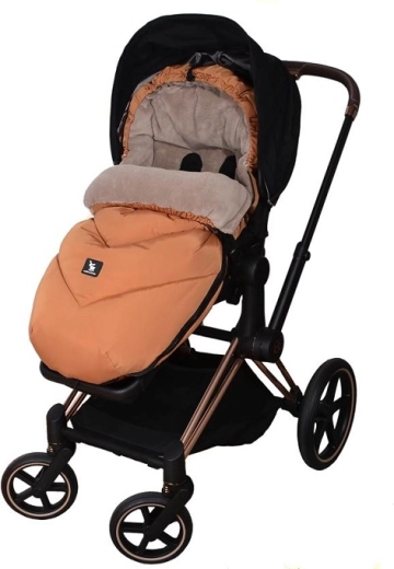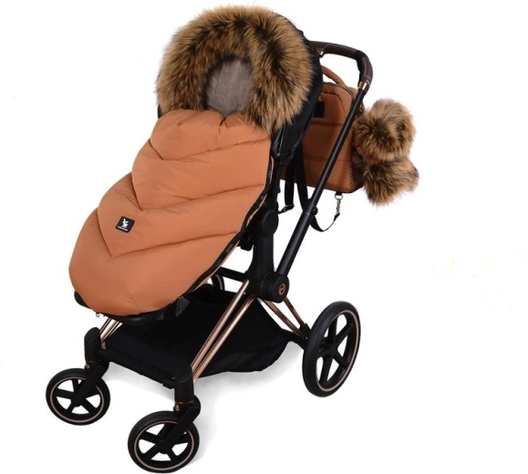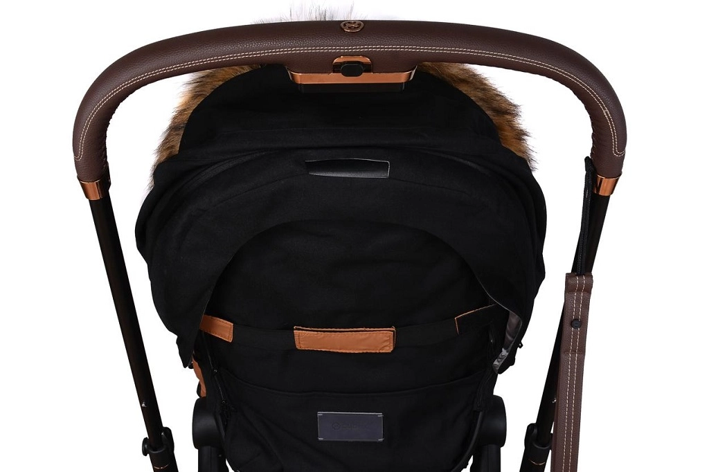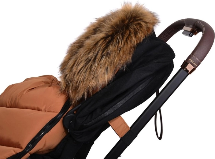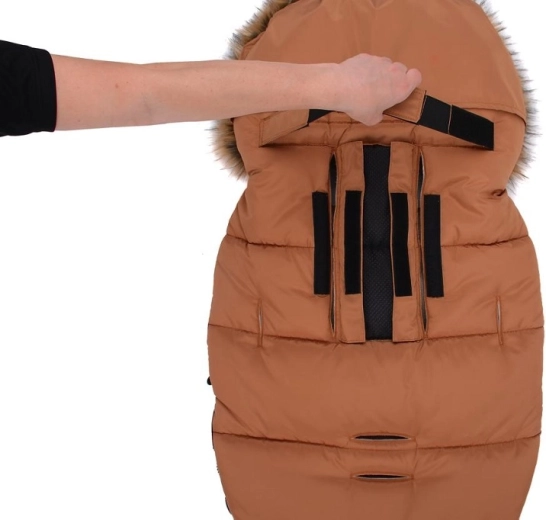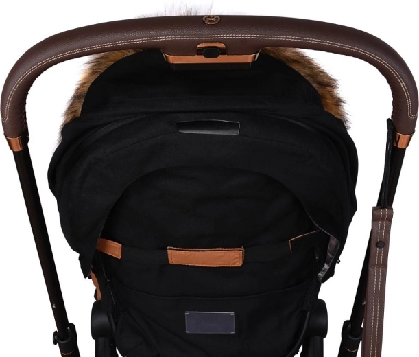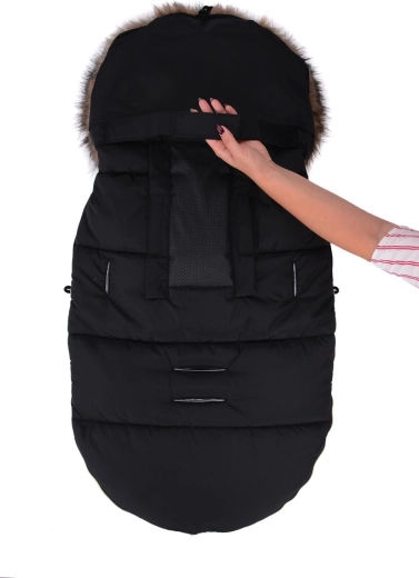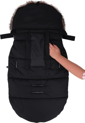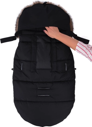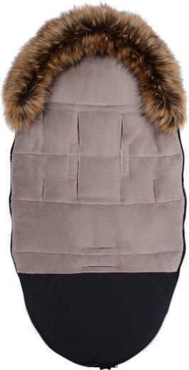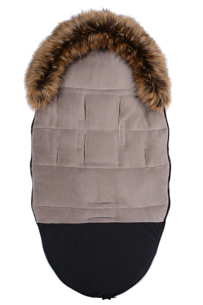 Den praktiske lynlåslukning gør det nemt at klæde på og ventilere, og frontpanelet kan åbnes helt på begge sider. Takket være åbninger til 5-punktssele og en bagrem til fastgørelse på ryglænet sidder fodposen sikkert i forskellige typer barnevogne. Det stilfulde look fuldendes af aftagelig kunstpels på hætten.