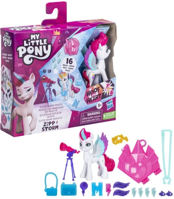 Oplev magien i My Little Pony-universet med det legende Magisk Cutie Mark-sæt! I pakken finder du en yndig 8 cm pony med poserbare led, en enhedsnøglering til at sætte fast vedhæng og tilbehør samt indsættelige Cutie Marks, der giver ponyerne deres unikke kraft. Takket være funktionen “Hov-til-hjerte” og muligheden for at pynte manken med hårsmykke-vedhæng får børn masser af fantasifuld leg både hjemme og på farten.