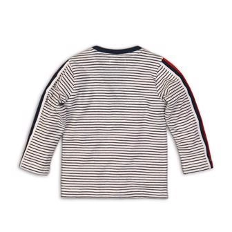 Stilfuld langærmet DIRKJE T-shirt til børn i hvid–marineblå stribe, som byder på behagelig hverdagskomfort, blødt materiale med bomuld og en praktisk brystlomme. Takket være de lange ærmer og den behagelige ribstrik er den ideel til heldagsleg og børnehave.