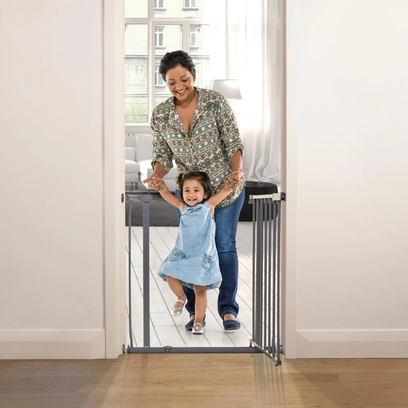 Dreambaby Ava sikkerhedsgitter er en pålidelig løsning til at adskille områder i hjemmet. Trykmonteringssystemet muliggør hurtig installation uden boring, mens den robuste metalkonstruktion i elegant grå passer til moderne interiører. Åbning med én hånd og to-vejs åbning gør passagen nem for voksne, mens gitteret forbliver sikkert låst for børn op til 24 måneder.