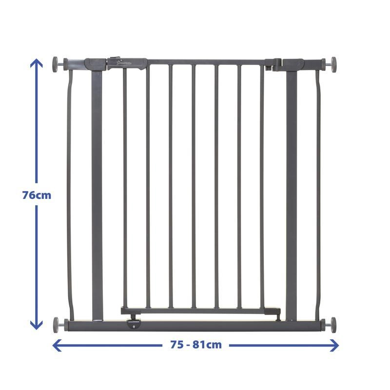 Hold dit hjem sikkert for både børn og kæledyr med Dreambaby Ava. Den robuste metalkonstruktion, trykmontage uden boring og betjening med én hånd giver nem brug i hverdagen. Passer til åbninger 75–81 cm og kan udvides op til 99 cm. To-vejs åbning, bred passage og funktionen forbliver åben gør gitteret praktisk til døre, gange og trapper.