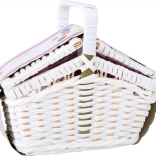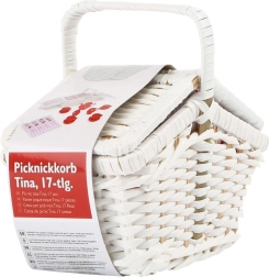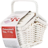 Den hvide flettekurv tilbyder opbevaringsplads til hele sættet, mens dens stærke konstruktion og dekorative elementer giver en autentisk picnickfølelse.