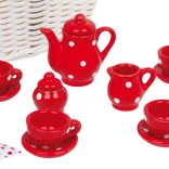 Gør dig klar til en fantastisk picnic med vores børne-tesæt. Dette charmerende sæt indeholder alt, du har brug for – fra kande, kopper, tallerkener til mælk og sukkerskåle, alt lavet i holdbar keramik med et muntert rødt og hvidt prikket design. Alle 17 dele er omhyggeligt opbevaret i en elegant flettekurv med stofservietter.