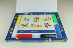 - Farvede dele, som børnene placerer på underlaget efter deres fantasi eller den medfølgende vejledning.