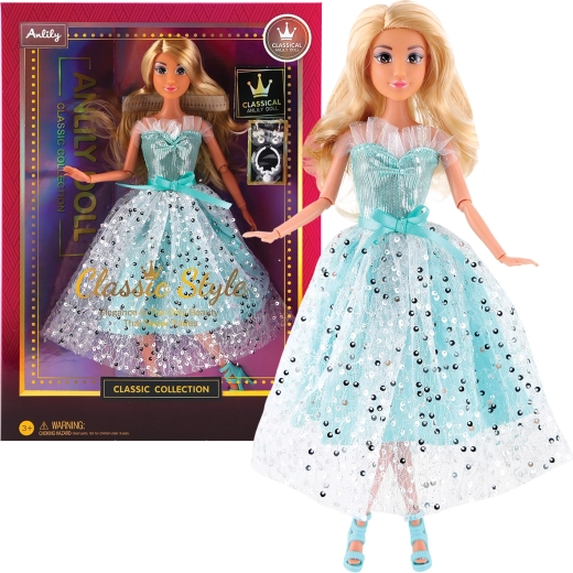 Oplev modens magi med denne elegante dukke i lange lyseblå selskabskjoler. Takket være det stilfulde design og de præcise detaljer bliver den stjernen på enhver børnemodeshow. Materialer af høj kvalitet sikrer tryg og behagelig leg.