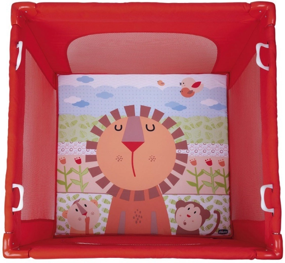 Chicco børnelegegård med legetæppe Lion forener sikkerhed, komfort og legende stimulering i ét. Det farverige og bløde underlag med dyremotiver understøtter sanseudvikling og kan bruges separat uden for legegården. Net-siderne sikrer ventilation og overblik, mens en lynlåslukket åbning gør adgangen nemmere.