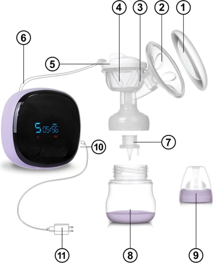 Massagepude, tætningspude, korpus med tragt, silikone-membran, adapter, silikoneslange, ventil, flaske 150 ml, sut, betjeningspanel, strømadapter, 2 mælkeopbevaringsposer