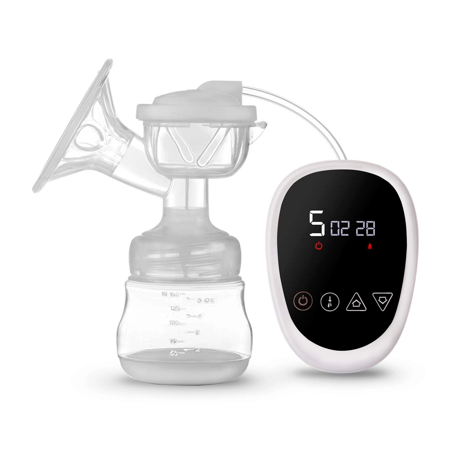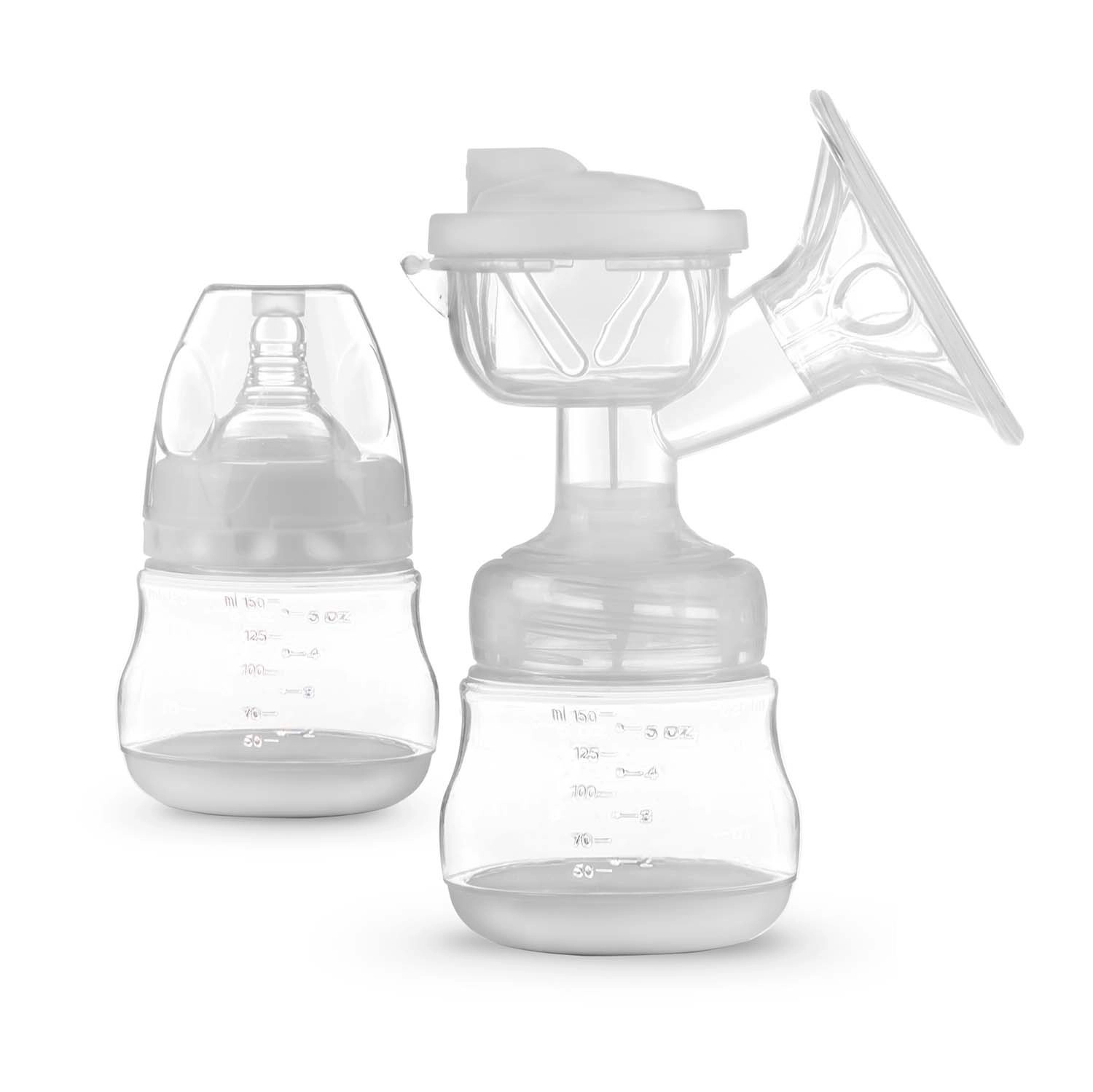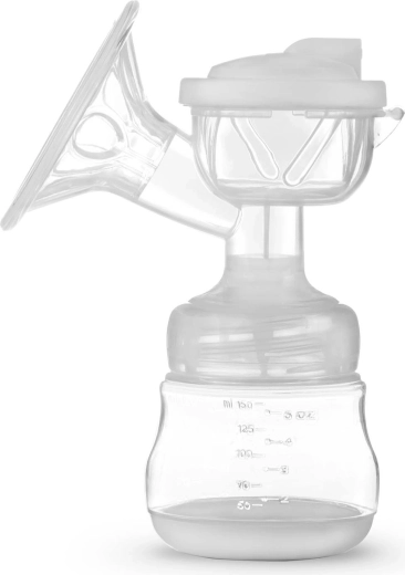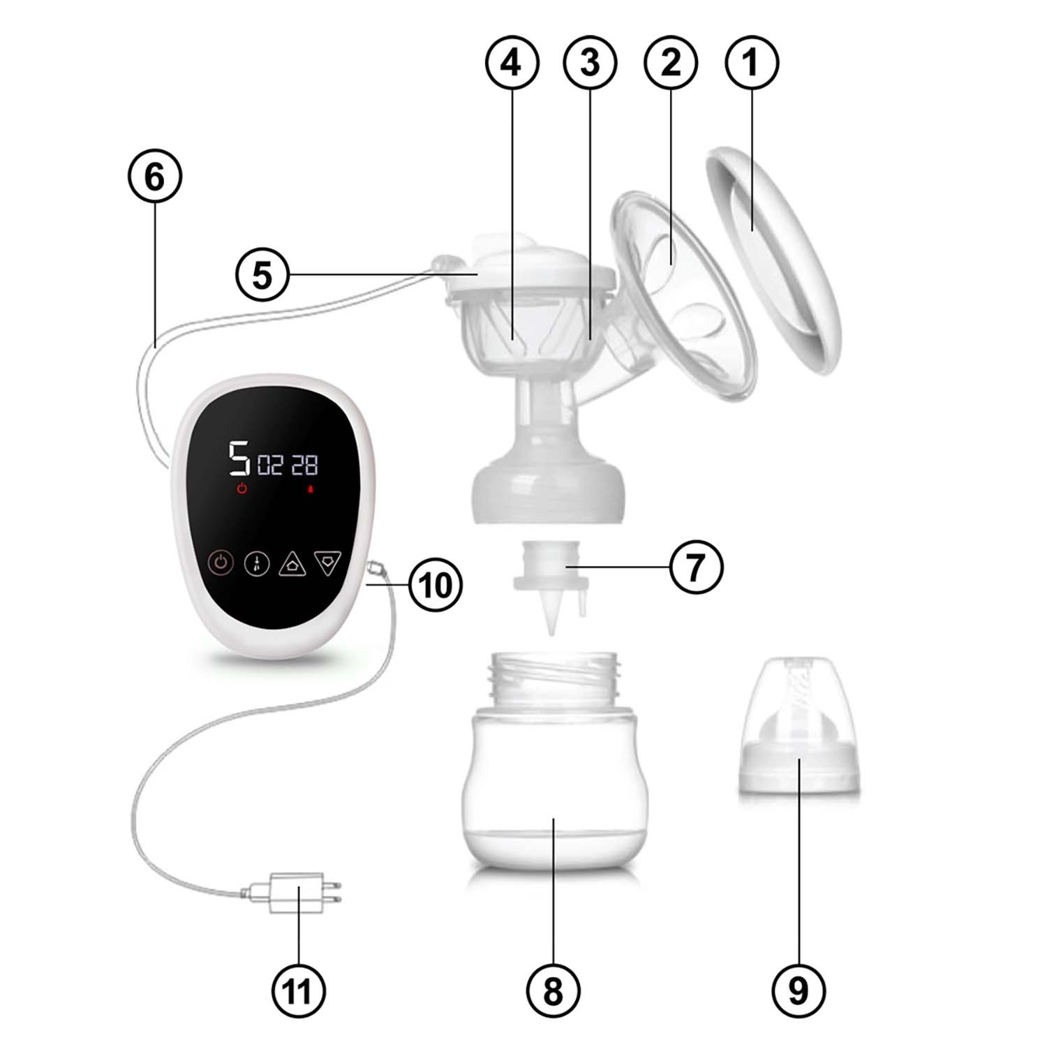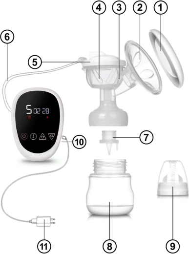 Tragt med massageindsats, pumpehus, silikonemembran og slange, ventil, 150 ml flaske, sut med hætte, kontrolenhed, strømadapter