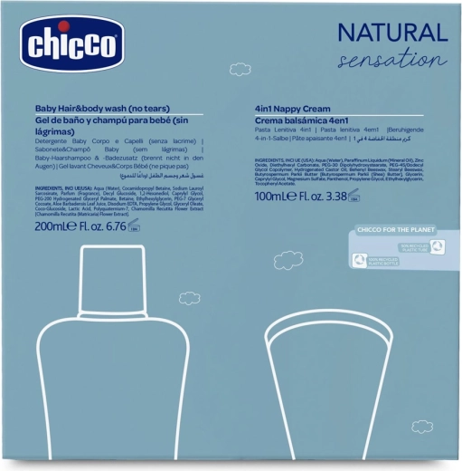 Gavesættet CHICCO Natural Sensation Daily Protection er et godt valg til den daglige babypleje. 2-i-1 shampoo og vaskegele renser nænsomt og efterlader hud og hår blødt og let at rede, mens zinksalven danner en beskyttende barriere og effektivt forebygger irritation og rødme.