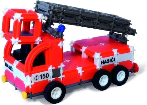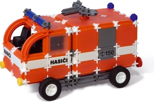 Byg en brandbil med løfteplatform, en stor tankvogn med mulighed for at dreje og et kommandoteknisk køretøj. Der medfølger tematiske klistermærker “HASIČI, RESCUE, FIRE” samt alarmnummeret 150, som hjælper børn med at lære vigtige sikkerhedsprincipper.