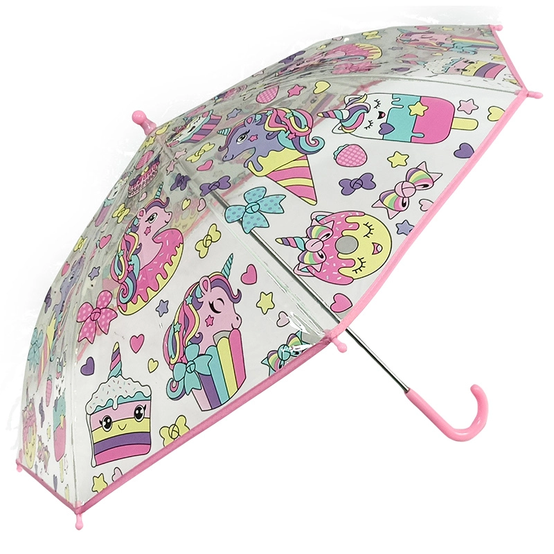 Sød gennemsigtig børneparaply med enhjørningemotiv beskytter mod regn og lader samtidig børn se vejen tydeligt. Takket være den lette konstruktion og nemme betjening er den velegnet selv til små børn. Gennemsigtigt design, populært enhjørningemotiv og let åbning gør den til det ideelle tilbehør til børnehave og på farten.