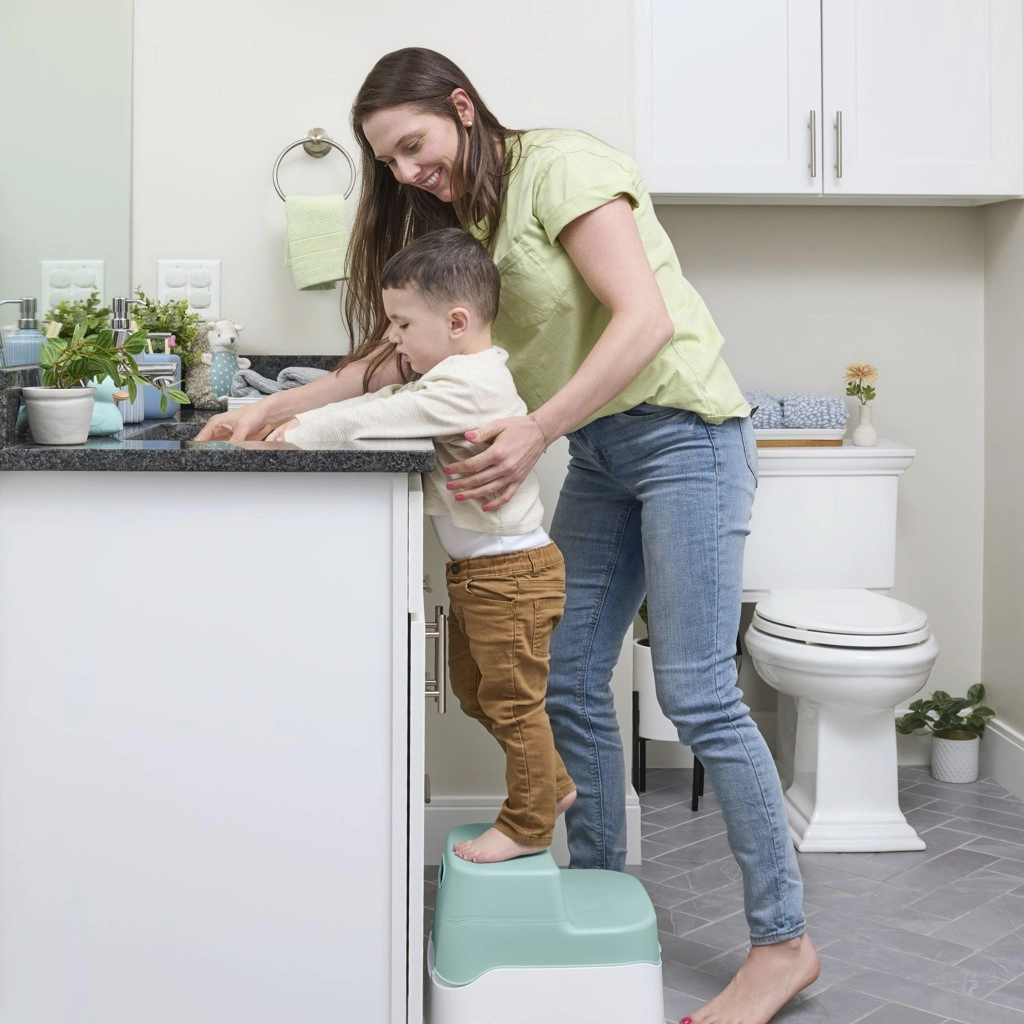 En stabil to-trins skammel med skridsikker overflade hjælper børn sikkert op til både toilet og håndvask.