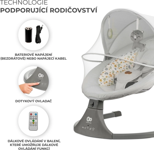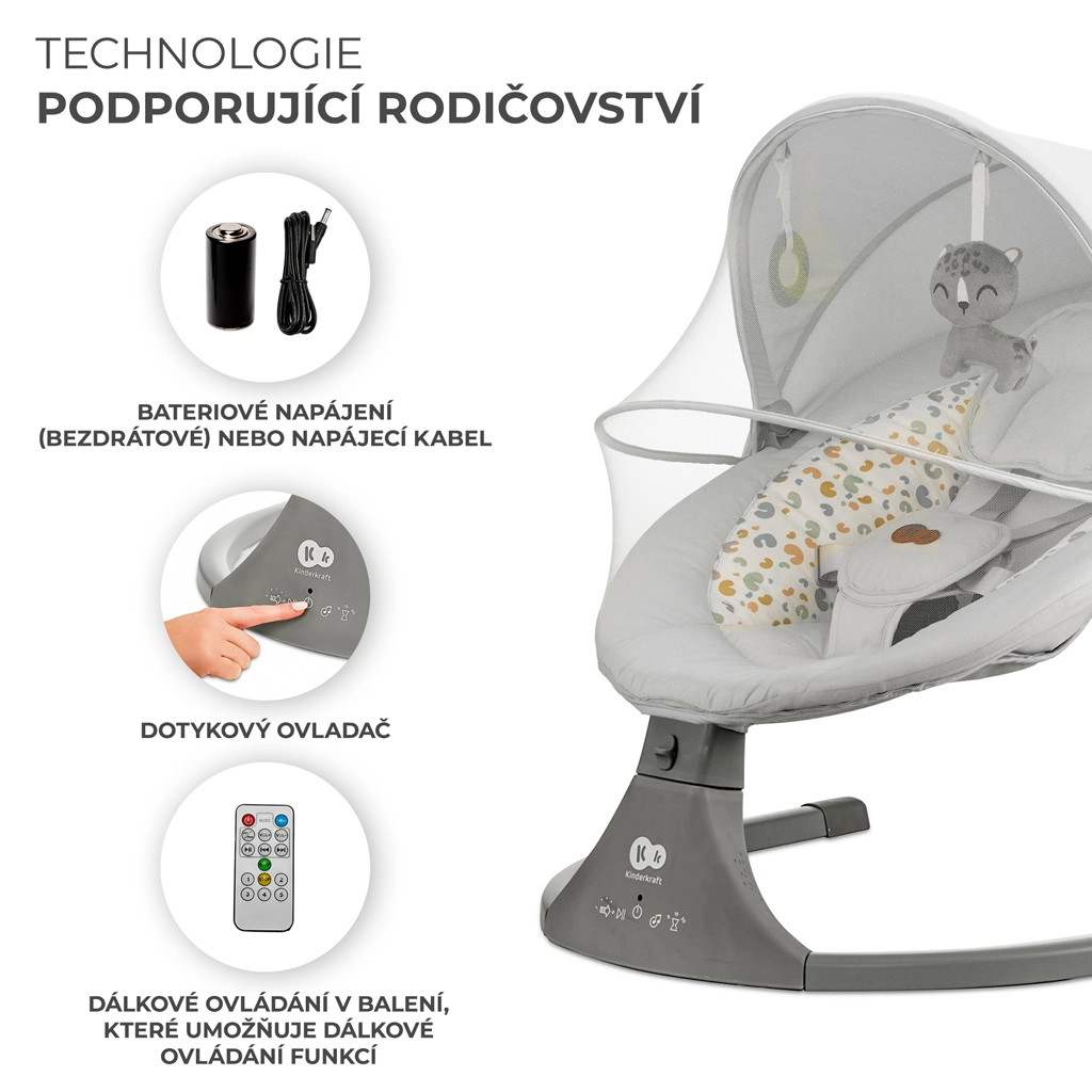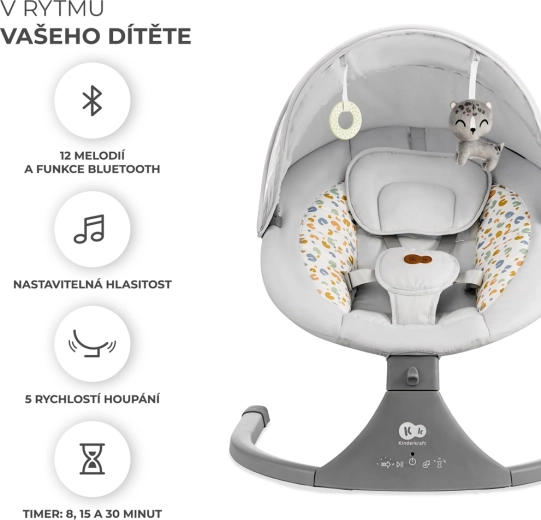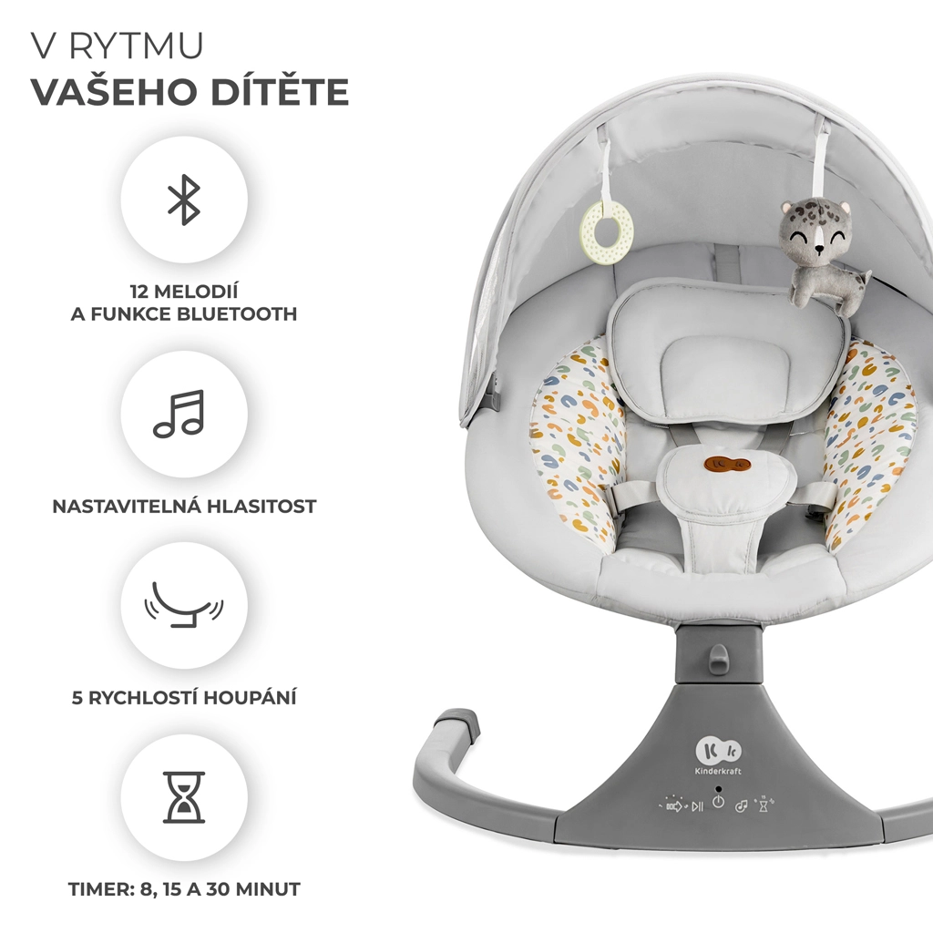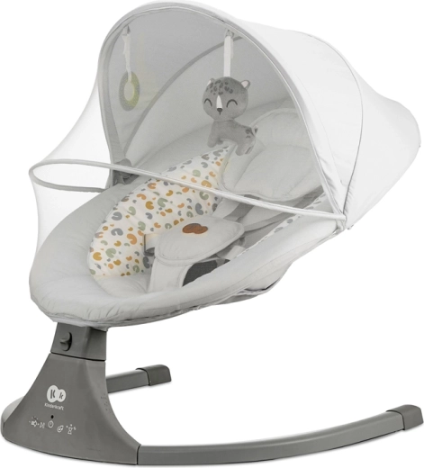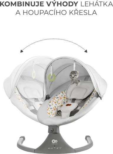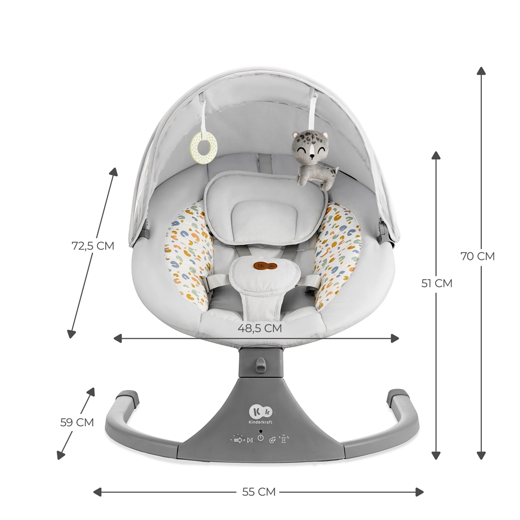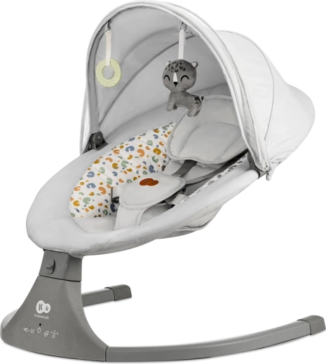 Vippestolen Kinderkraft LUMI kombinerer moderne teknologi og sikkerhed i designet for behagelig putning fra fødslen op til 9 kg. Takket være den sideværts vugning føler babyen sig som i favnen, mens den stille motor ikke forstyrrer søvnen. Med mobil tilslutning via Bluetooth og USB-indgang kan du nemt afspille yndlings-vuggeviser direkte fra telefonen.