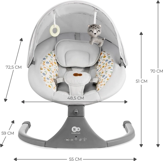 Berolig din baby på et øjeblik med 2-i-1 vippestolen og vuggen Kinderkraft LUMI i den elegante farve Premium Light Grey. Den unikke sideværts vuggebevægelse efterligner de naturlige bevægelser i maven, mens 5 vuggehastigheder, 12 melodier med lydstyrkekontrol og Bluetooth/USB-afspilning sikrer rolig indslumring. For maksimal komfort får du fjernbetjening, blød polstring med hovedstøtte og 5-punkts sikkerhedssele.