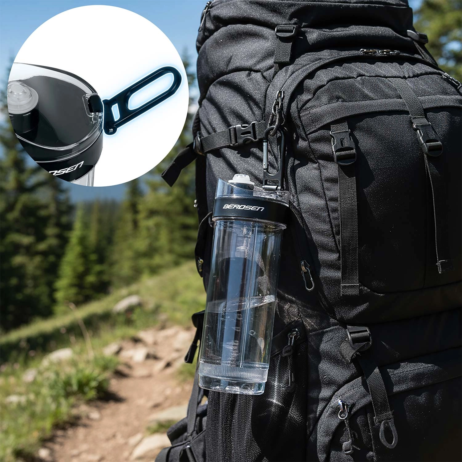 Praktisk spænde/karabinhage gør det muligt at fastgøre flasken til en rygsæk eller taske – ideel til vandreture, løb eller bybrug.